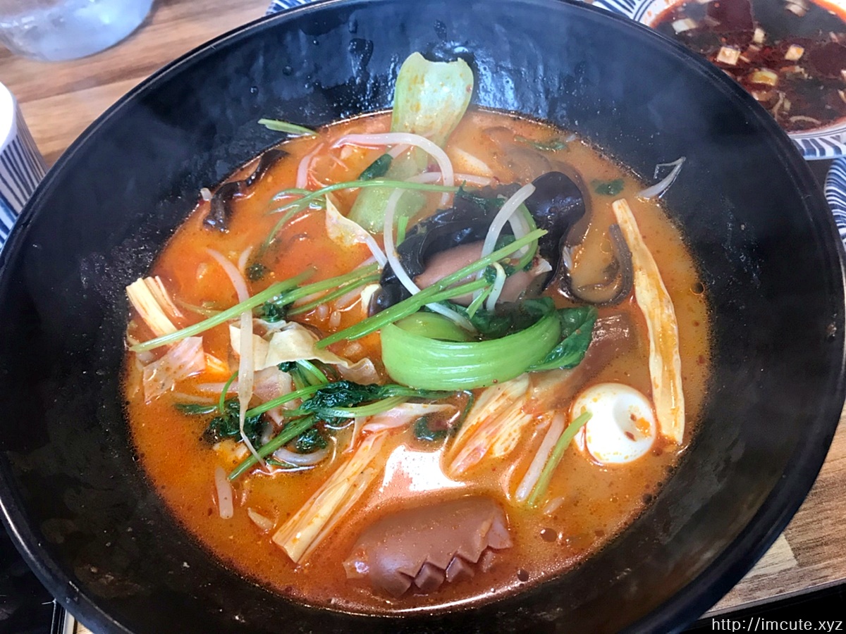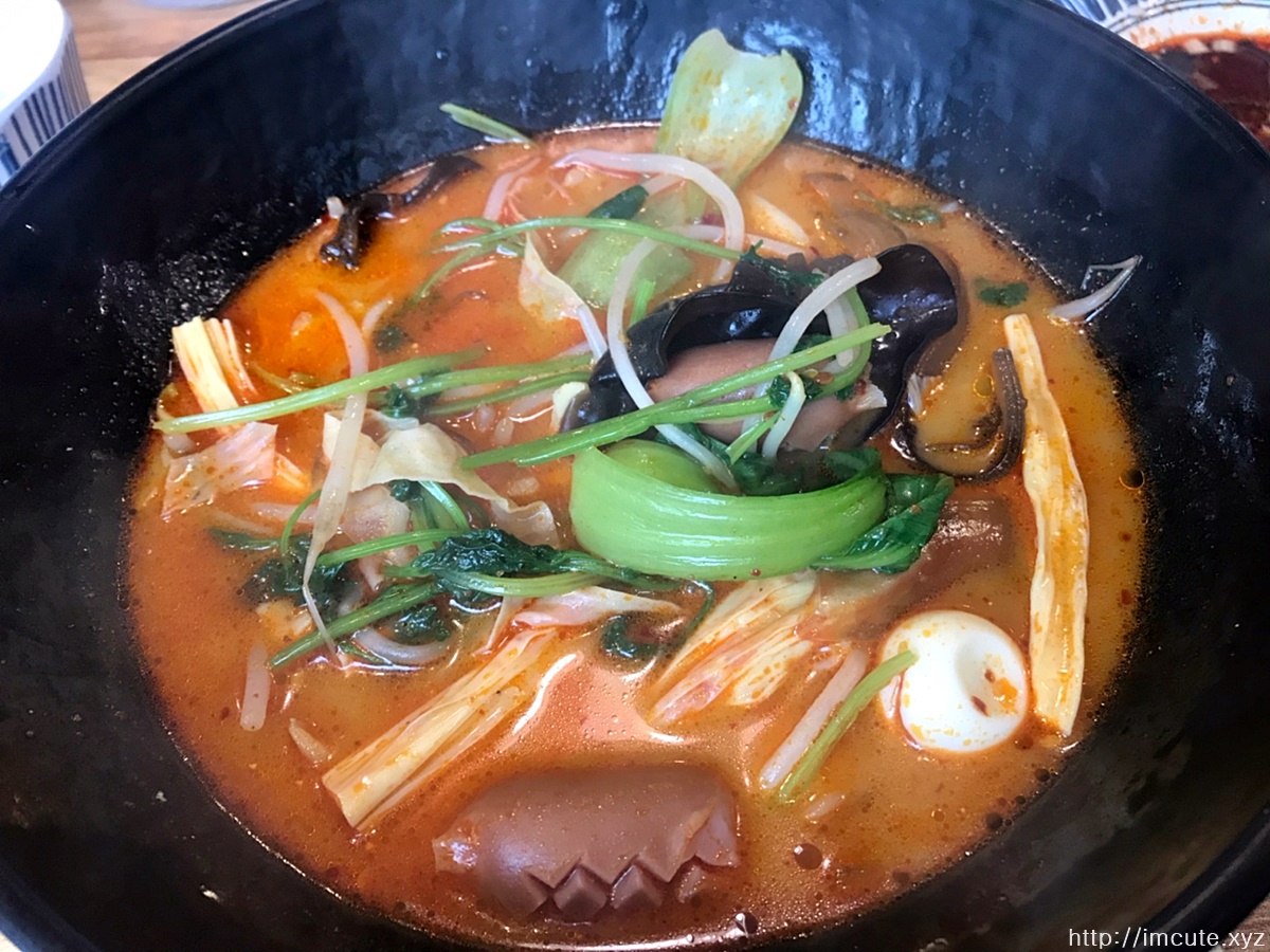 짜잔! 마라탕입니다. 목이버섯에 숙주 그리고 청경채 가득 넣고 푸주에 이것저것 다 들어있는 이 자태를 보세요, 너무 곱지 않나요? 그리고 맛있는 소세지도 보이고 이거야말로 진국이 따로 없었어요. 저는 항상 비엔나 소세지도 넣어주는데요 고기를 안 넣을땐 비엔나를 넣어야 국물 맛이 괜찮드라고요.
