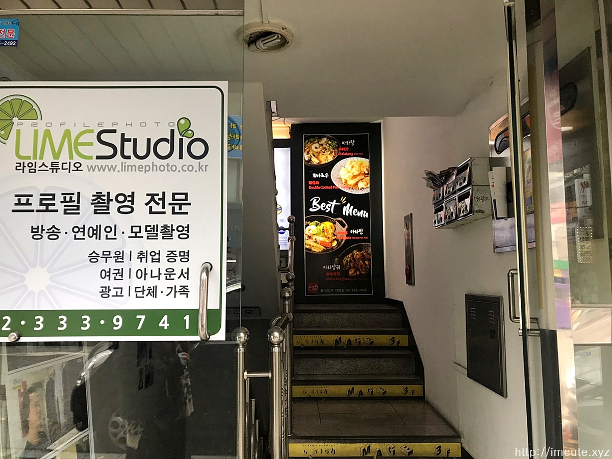 2층으로 올라와주면 가게가 있습니다! 근처에는 라임스튜디오라고 해서 프로필사진 전문 스튜디오가 있었어요. 홍대에는 참 문화에 관련된 곳이 많더라고요.