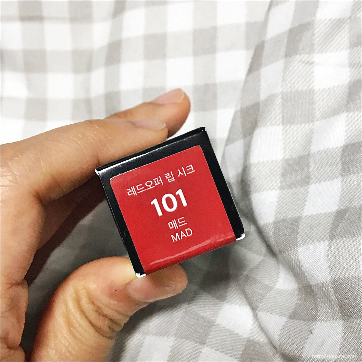 바로 이 아이인데요, 레드오퍼 립 시크는 101번 매드 색이 가장 정석레드 색에 가깝더라고요. 저는 모험을 하지 않기 때문에 무조건 핑크끼 없고 이런 레드색이 좋습니다.