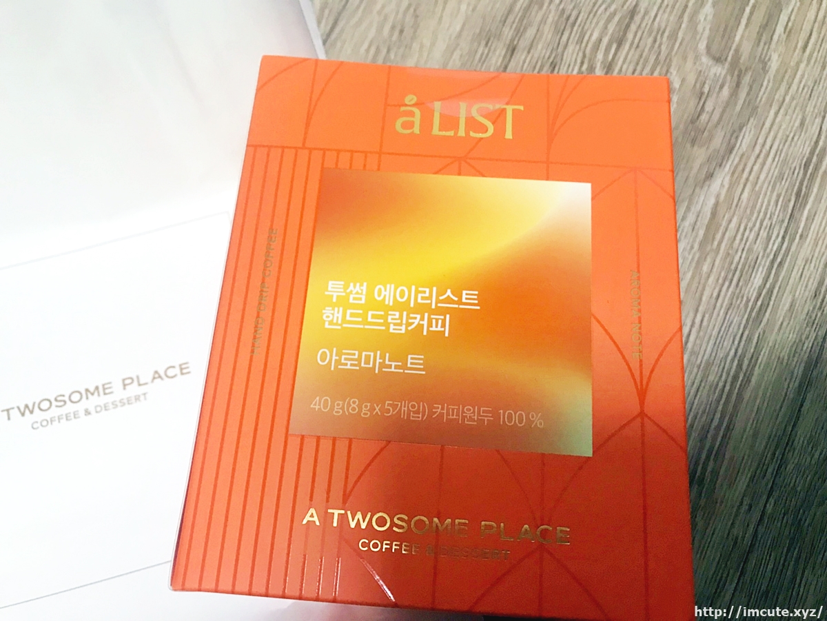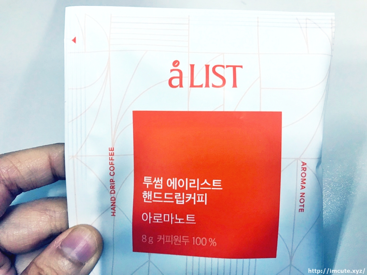 후후. A LIST (에이리스트) 핸드드립커피의 비주얼이고요 40g입니다. 총 40g이며 1개입당 8g씩 5개입 들이네요. 그리고 커피원두 100%인걸로 봐서 정말 커피만 담았고 다른것은 없는가 봅니다. 투썸플레이스는 커피와 디저트로도 유명한 카페인데요 스타벅스에 가지 않을 때 전 투썸에 자주 갑니다.