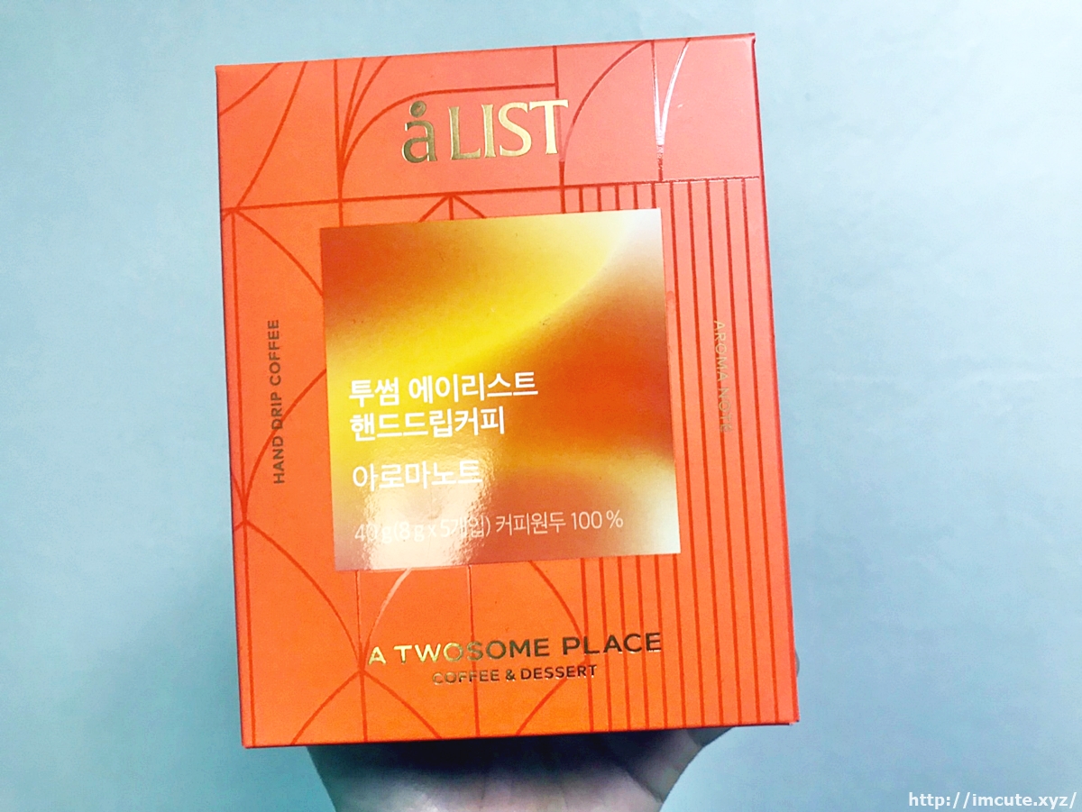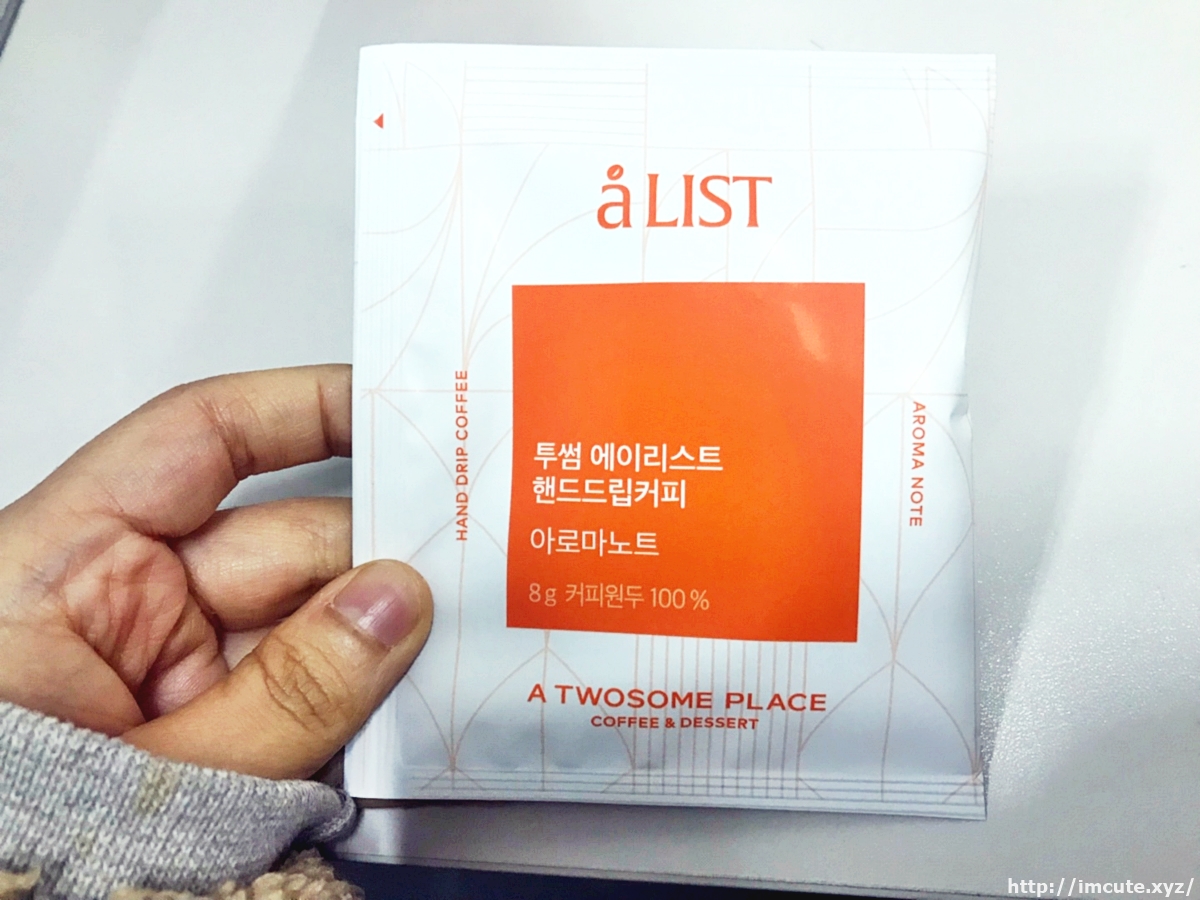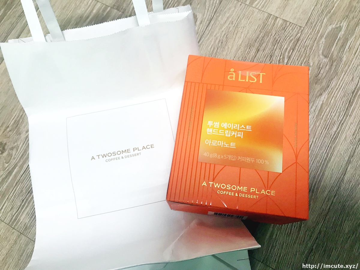 후후. A LIST (에이리스트) 핸드드립커피의 비주얼이고요 40g입니다. 총 40g이며 1개입당 8g씩 5개입 들이네요. 그리고 커피원두 100%인걸로 봐서 정말 커피만 담았고 다른것은 없는가 봅니다. 투썸플레이스는 커피와 디저트로도 유명한 카페인데요 스타벅스에 가지 않을 때 전 투썸에 자주 갑니다.