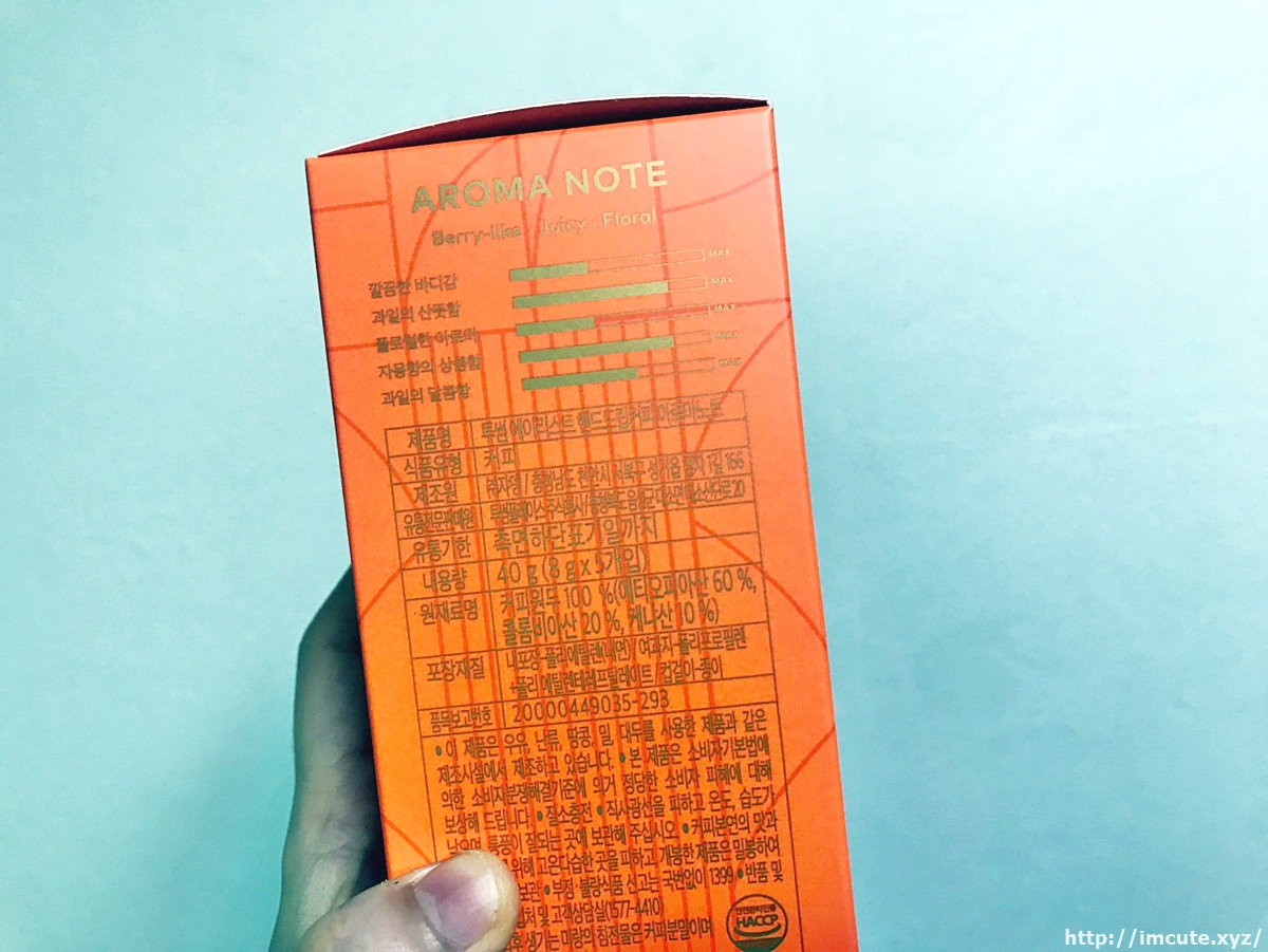 커피의 맛이 대략적으로 쓰여있어요. 바디감을 포함해서 과일의 산뜻함이 들어있다고 표현이 되어있어요. 플로럴한 아로마에 자몽향의 상큼함이 들어있는 데다가 과일의 달콤함까지 들어있는 커피라니 가히 상상이 가시나요? 투썸 매장에서 맛나게 먹었던 그 맛을 여기서 보다니 꿈만 같습니다.
