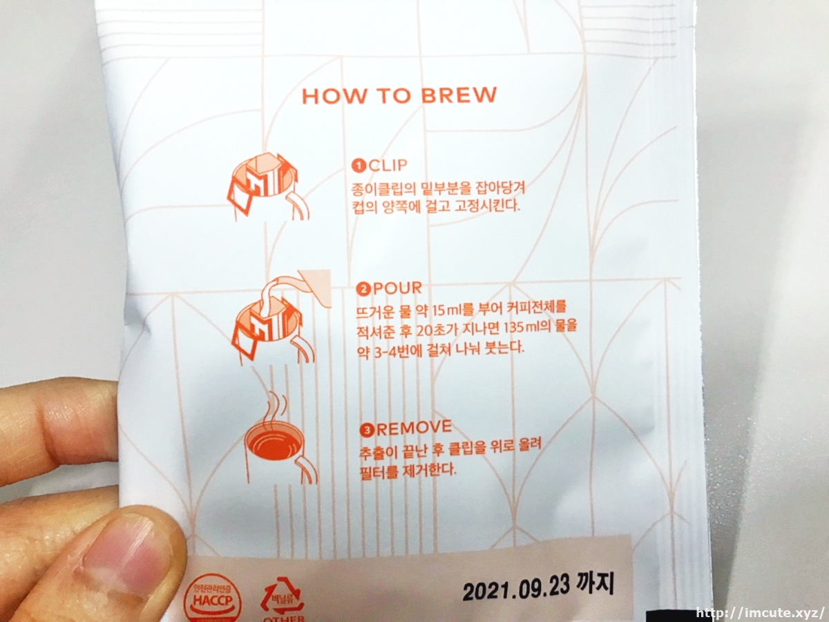 옆부분에는 투썸 핸드드립 커피 먹는법이 쓰여있습니다. 종이클립의 일부분을 잡아당겨 컵에 고정시킨 후 물 약 15ml를 부어 커피전체를 적셔준 후, 20초가 지나면 135ml의 물을 약 3~4번에 걸쳐 나누어 부으라고 되어있네요. 사실 이런 커피를 위한 주전자도 팔고 있다는 사실 아시나요? 추출이 끝난 후 클립을 위로 올려 필터를 제거하면 맛나게 먹을 수 있습니다만 저는 아쉬운 대로 정수기 뜨거운물로 먹어보았어요.