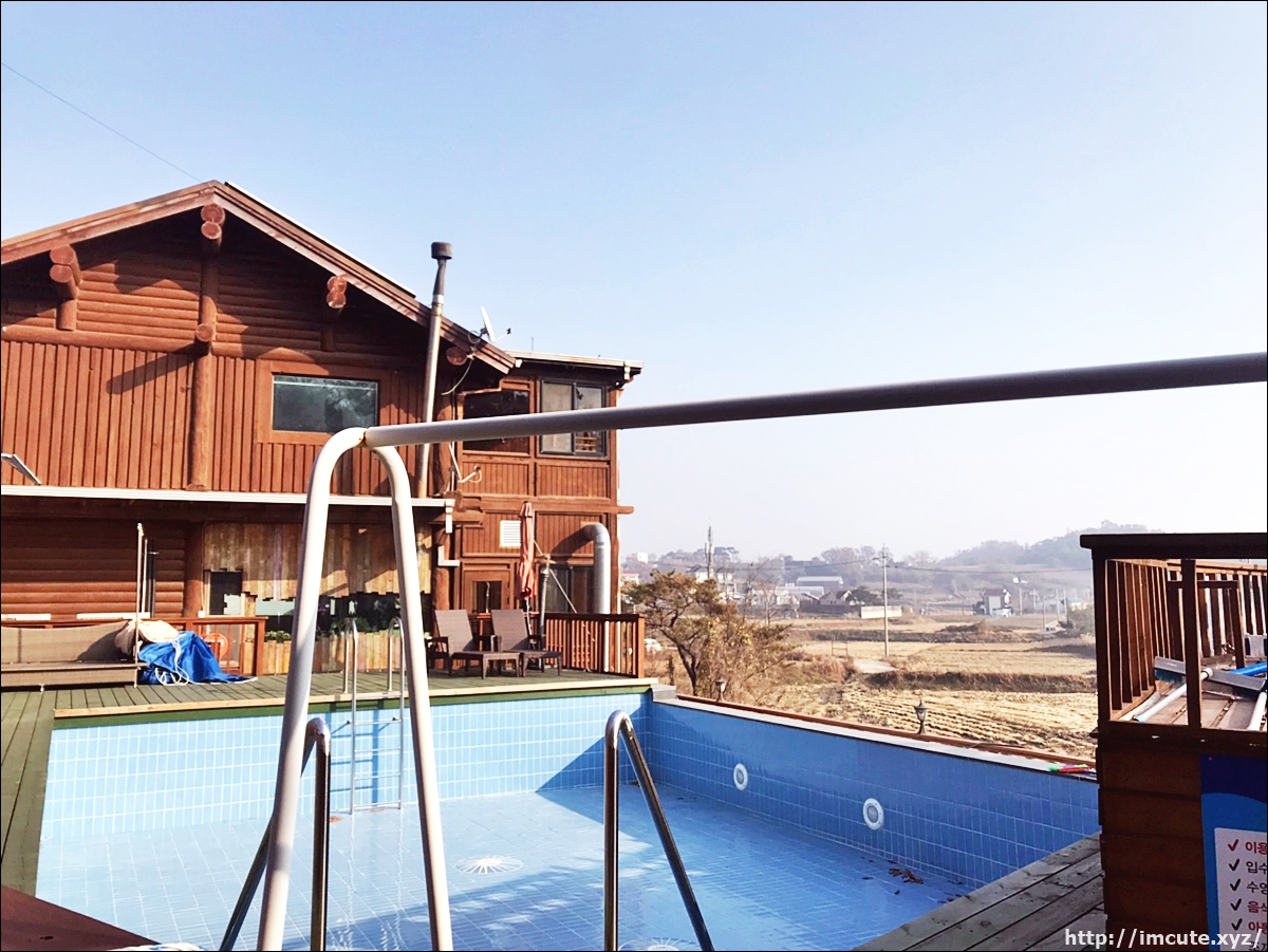 펜션 뒤쪽의 수영장이었습니다. 여름에 직접 이곳에서 수영을 하면 얼마나 재미있을지 상상이 가시나요? 뒤쪽에는 다른 객실로 추정되는 공간이 있고요. 저 뒤에는 밭이 펼쳐져 있습니다.