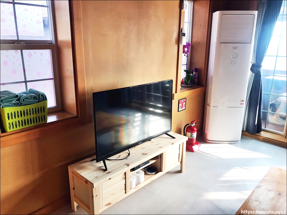 펜션내부는 사람들이 사용할 수건과 함께 TV 그리고 에어컨이 있었습니다. TV사이즈는 크고 펜션 전체가 나무로 지어진 느낌이라 내부도 안락했습니다.