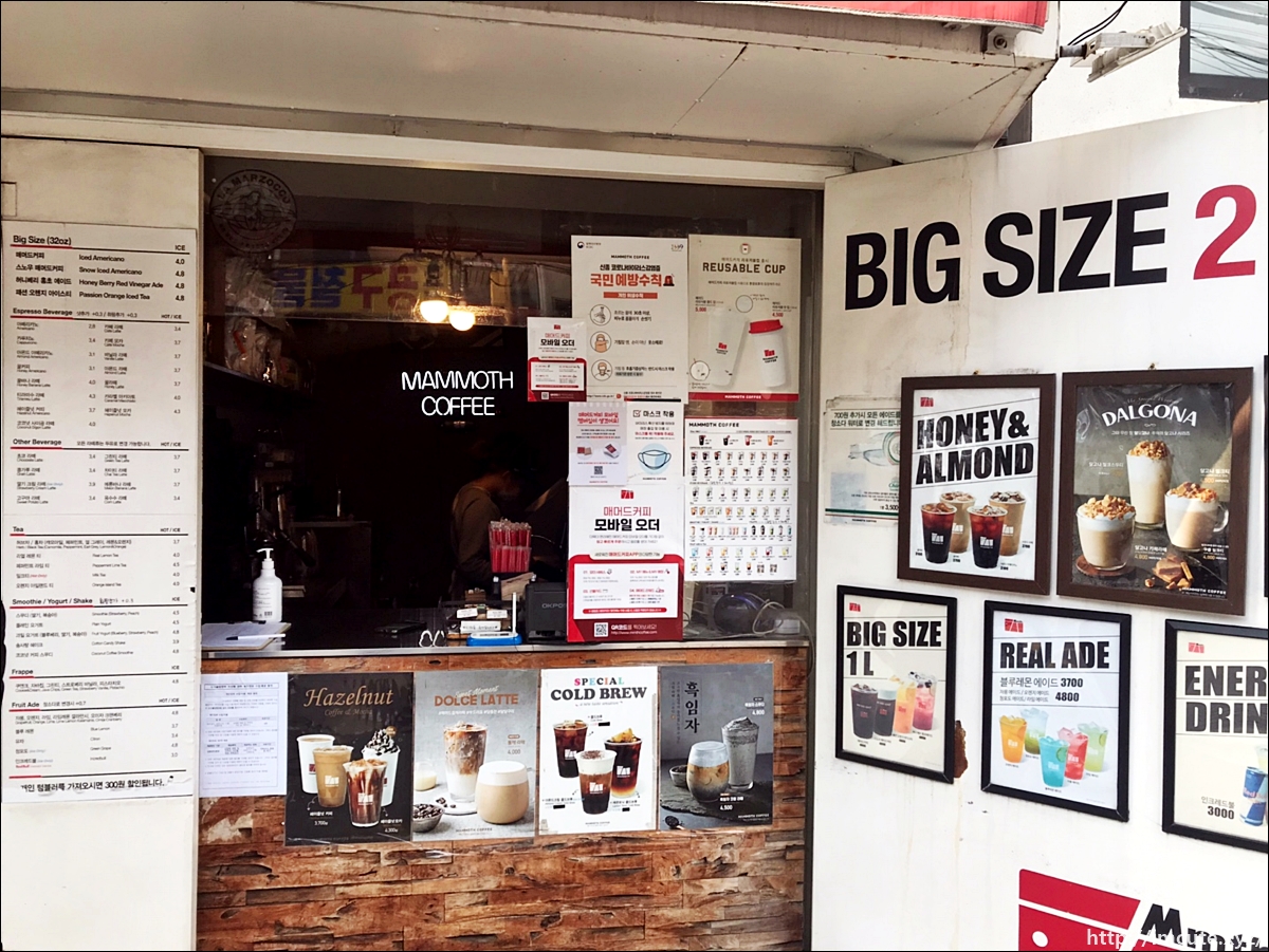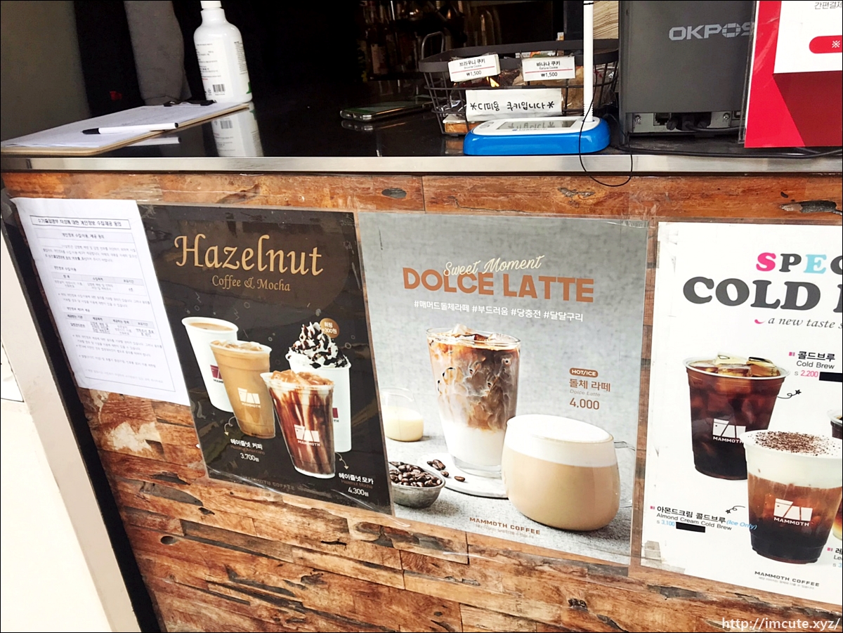 돌체라떼랑 헤이즐넛 시리즈도 붙어있었는데요 아무래도 매머드커피 홍대 본점이다 보니까 클 줄 알았는데 테이크아웃만 되는 매장이었습니다. 카페중에서도 1인 경영을 할 수 있고 소자본창업도 가능할 거 같다는 생각이 들었습니다. 매머드커피 홈페이지 가보면 프랜차이즈 창업 정보도 써 있어서 관심있게 보면 좋을거 같단 생각이 들었습니다.