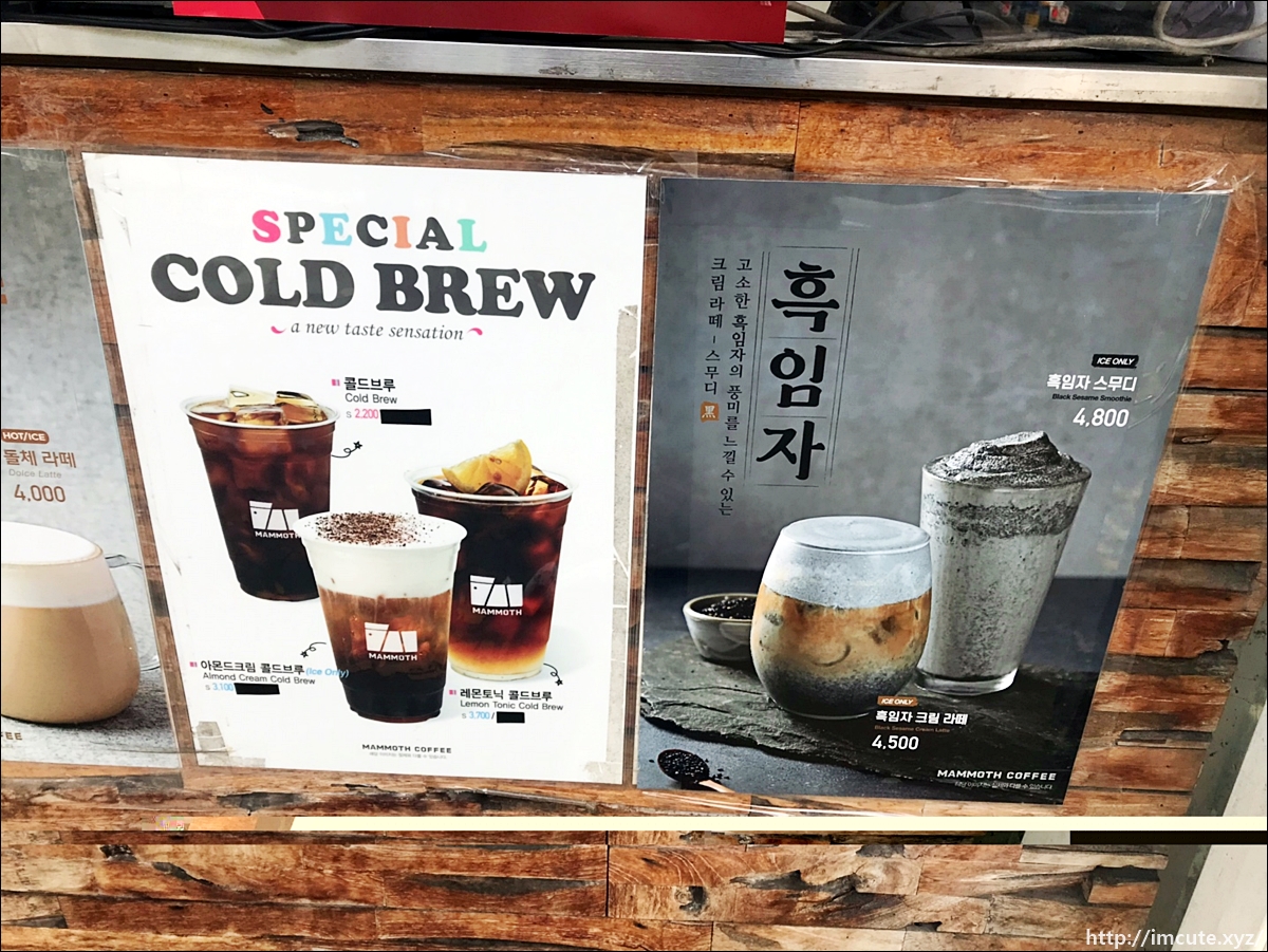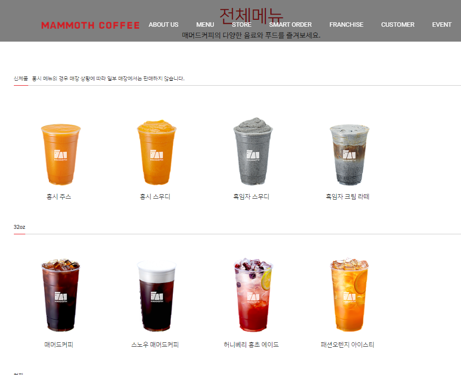 실제로 매머드커피 홈페이지에 들어가 보시면 판매 메뉴가 다 나와있었는데요 지역마다 가격은 조금 상이할 수 있을거 같긴 합니다.