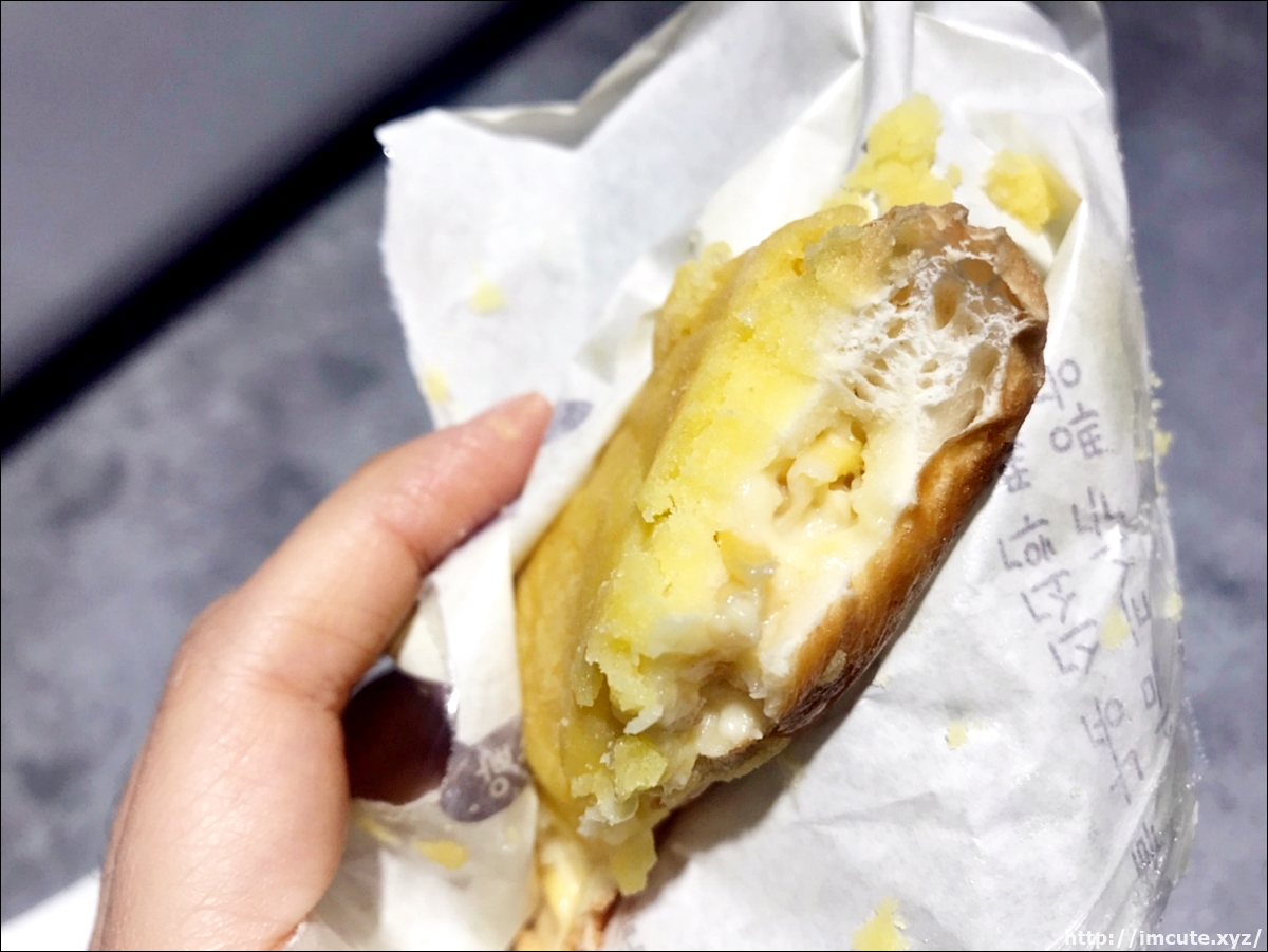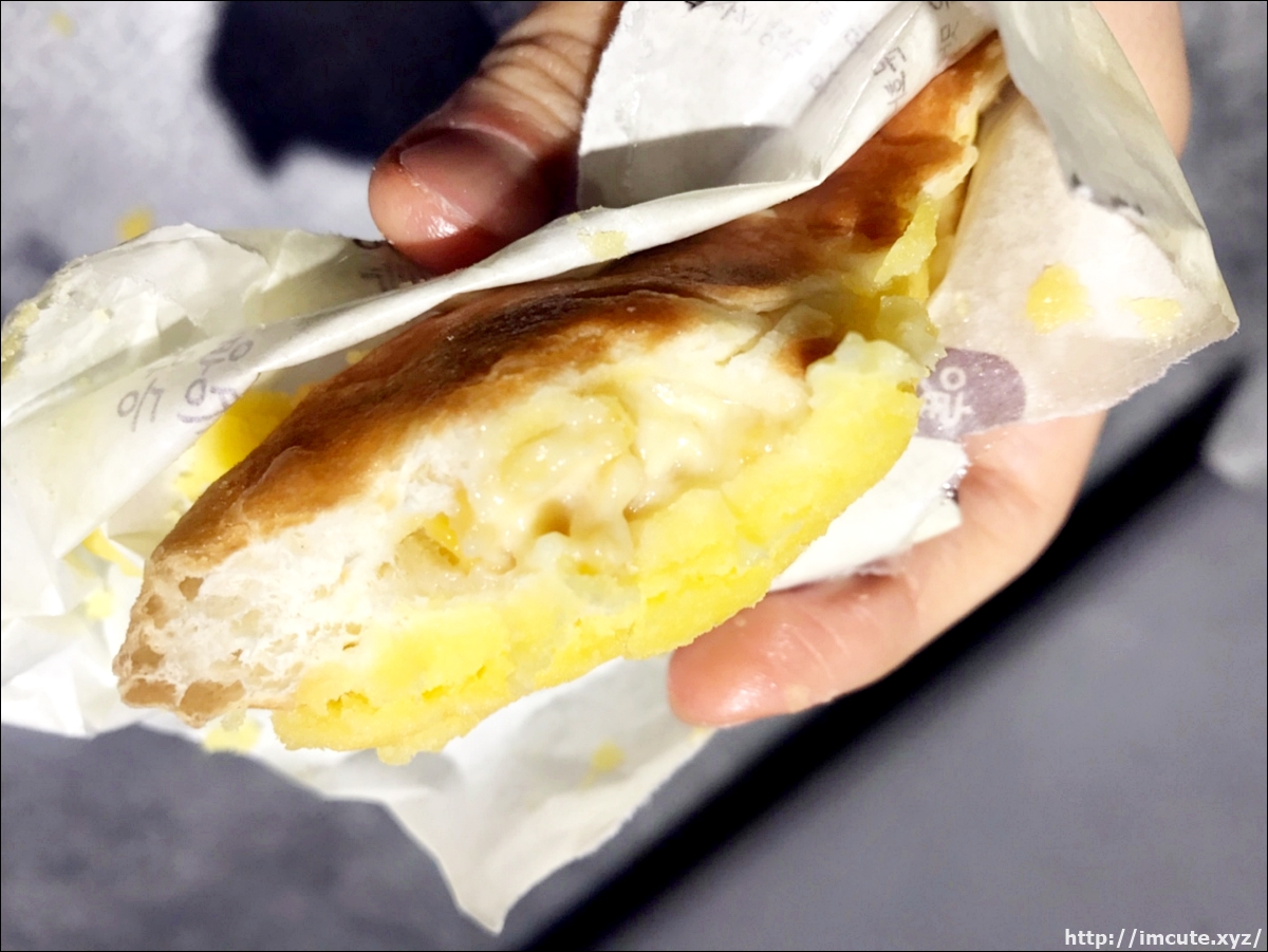 한 입 베어물어봅니다. 짜잔! 위에는 소보로같은것이 뿌려져있고 안에는 옥수수에 이곳에서만 만날 수 있는 특제 앙금이라 할까요, 소스라 할까요 아무튼 그런 것이 가득가득 들어 있습니다. 정말 매력적인데요 포장을 해와도 신선하게 먹을 수 있고 꽤 많은 보관시간이 흘렀는데도 직접 한듯한 그 빵느낌 그대로였어요. 전자렌지에 20~30초 데워먹어도 맛은 굿입니다.