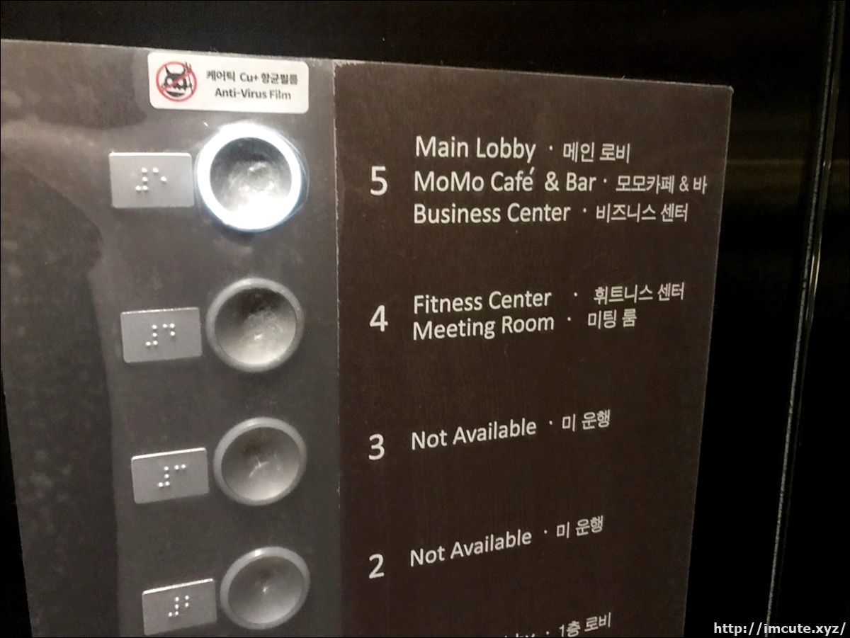 1층에는 로비가 있고 4층이 미팅룸&휘트니스 센터이다. 5층이 프론트 데스크에 모모카페&비가 있고 비즈니스 라운지가 있다. 호텔에서 운동해주는것도 꿀맛인데 요즘 사회적 거리두기 수칙이 있어서 그건 셀프생략 했다.