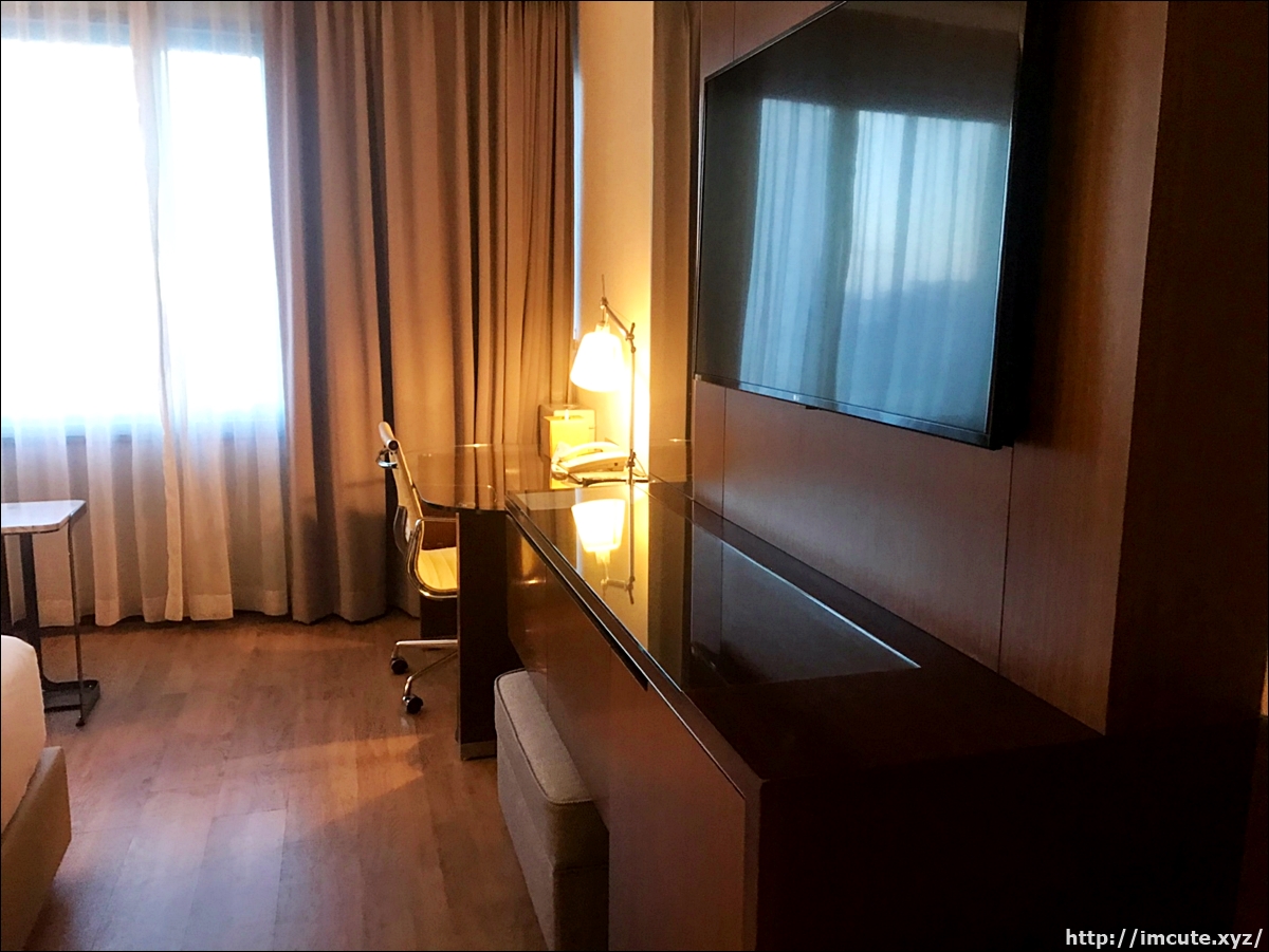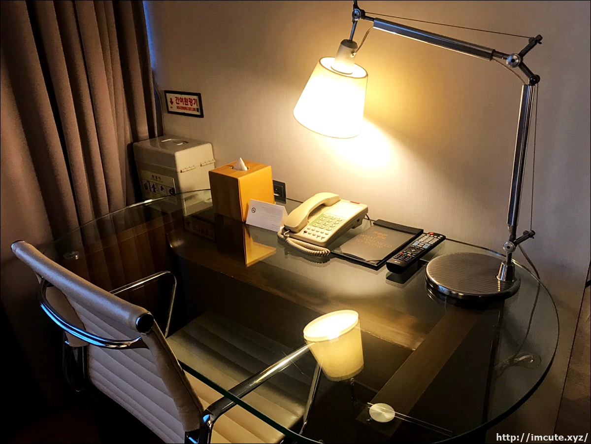뭔가 유리책상에서 사무가 보고싶어지는 이 느낌! 전화기랑 TV리모컨, 그리고 스탠드도 가지런하게 놓여져 있고 휴지도 깔끔하게 접어져 있다. 이렇게 고급 호텔의 분위기를 다 느껴본다. 나중에 이 곳에 다시 들리면 그 때는 갤럭시 탭이라도 갖고와서 깔짝깔짝 업무를 보고 싶을 정도다.