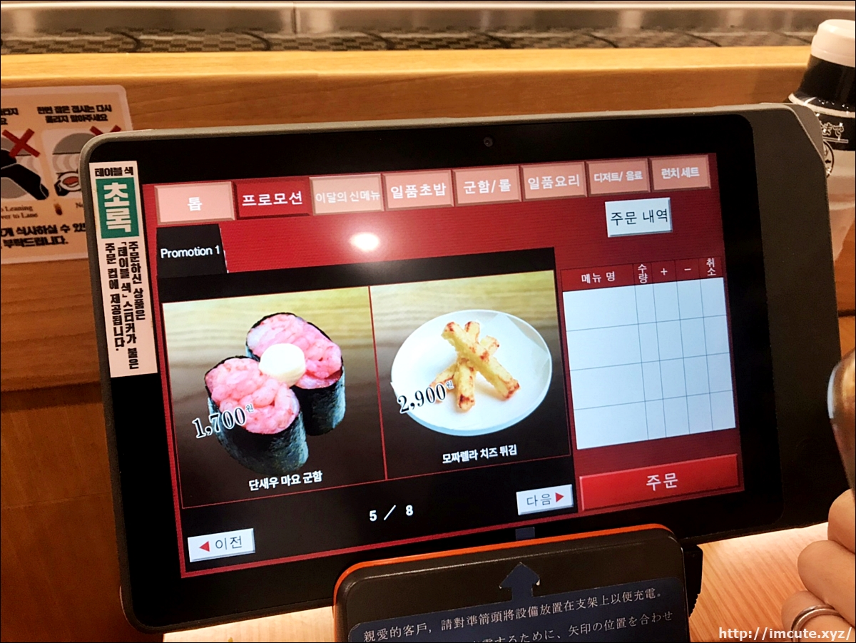 기계로 주문을 해보는데요~ 프로모션 메뉴중에서 감칠 모짜 생연어, 더블 생대하 미소마요가 있었고요 중량업 장어와 요즘 방어철이다보니 방어 초밥도 있어요.
