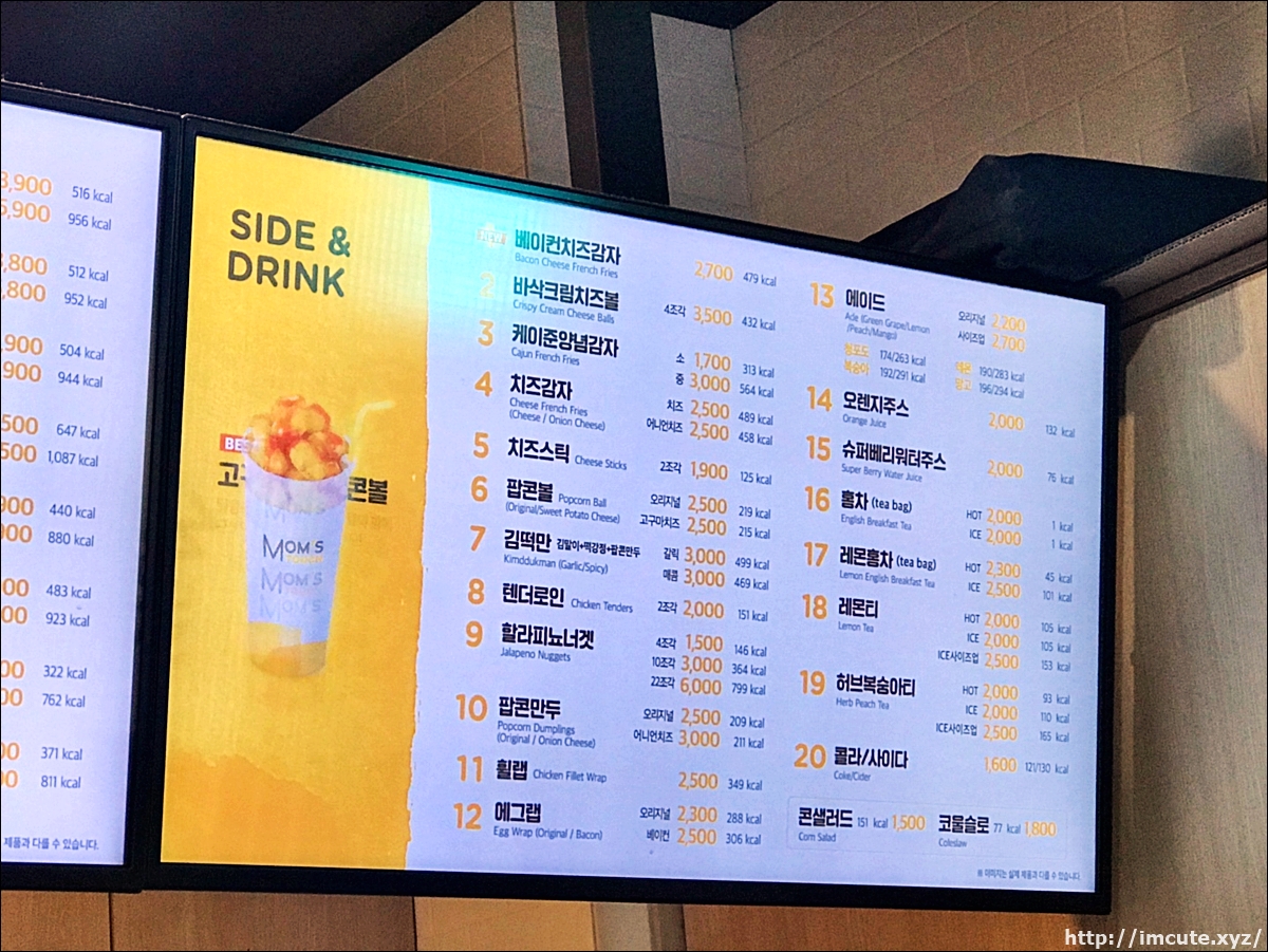 사이드와 드링크 가격도 빼놓을 수 없습니다.