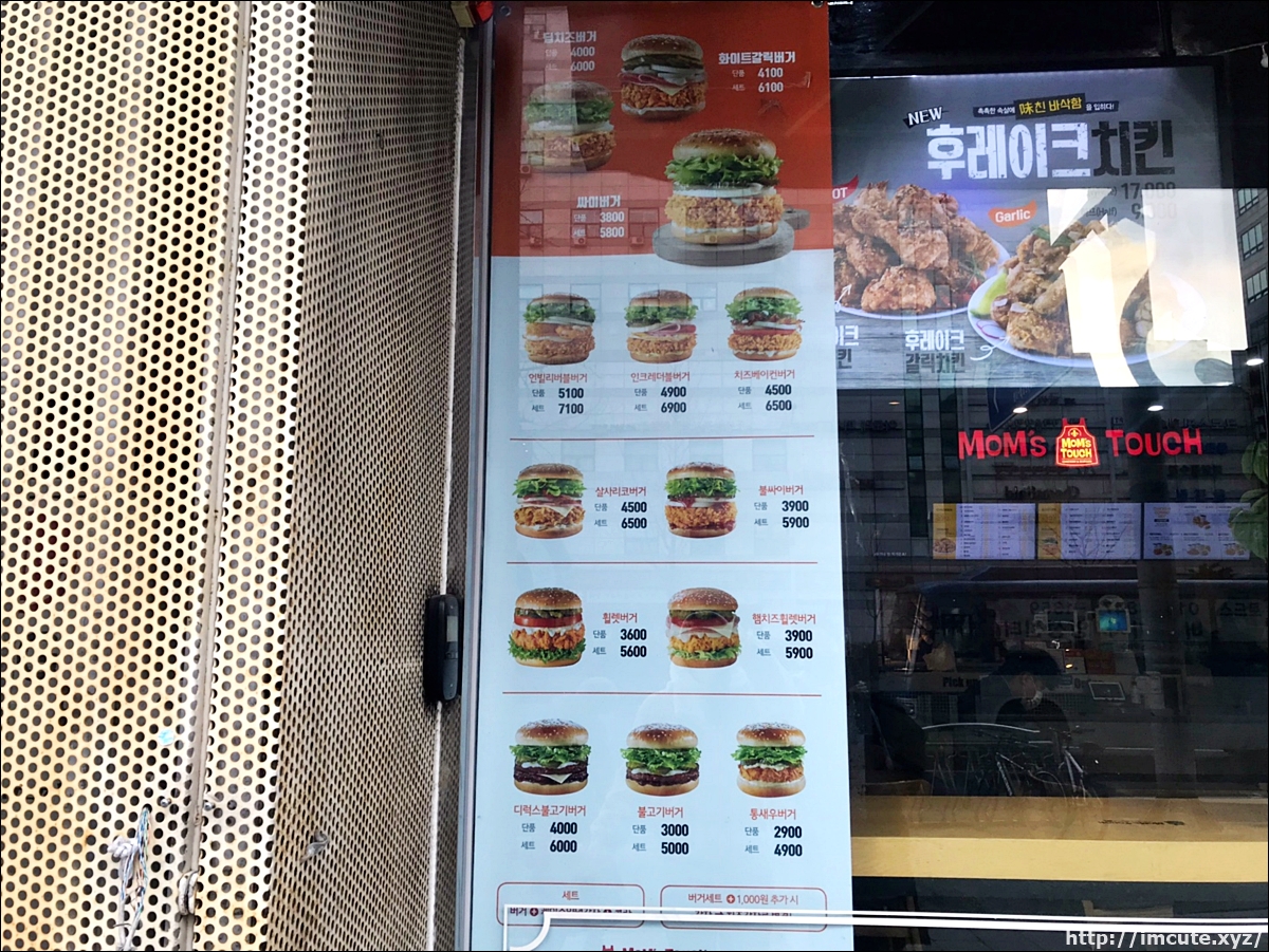 웬만한 맘스터치 체인점에 가면 이렇게 바깥에 햄버거 가격이 붙어있을거에요. 빨간색 글씨로 '나 맘스터치다'하는 가게 외관도 눈에뜨입니다. 저는 일산에 있는 매장에서 먹어 보았습니다.