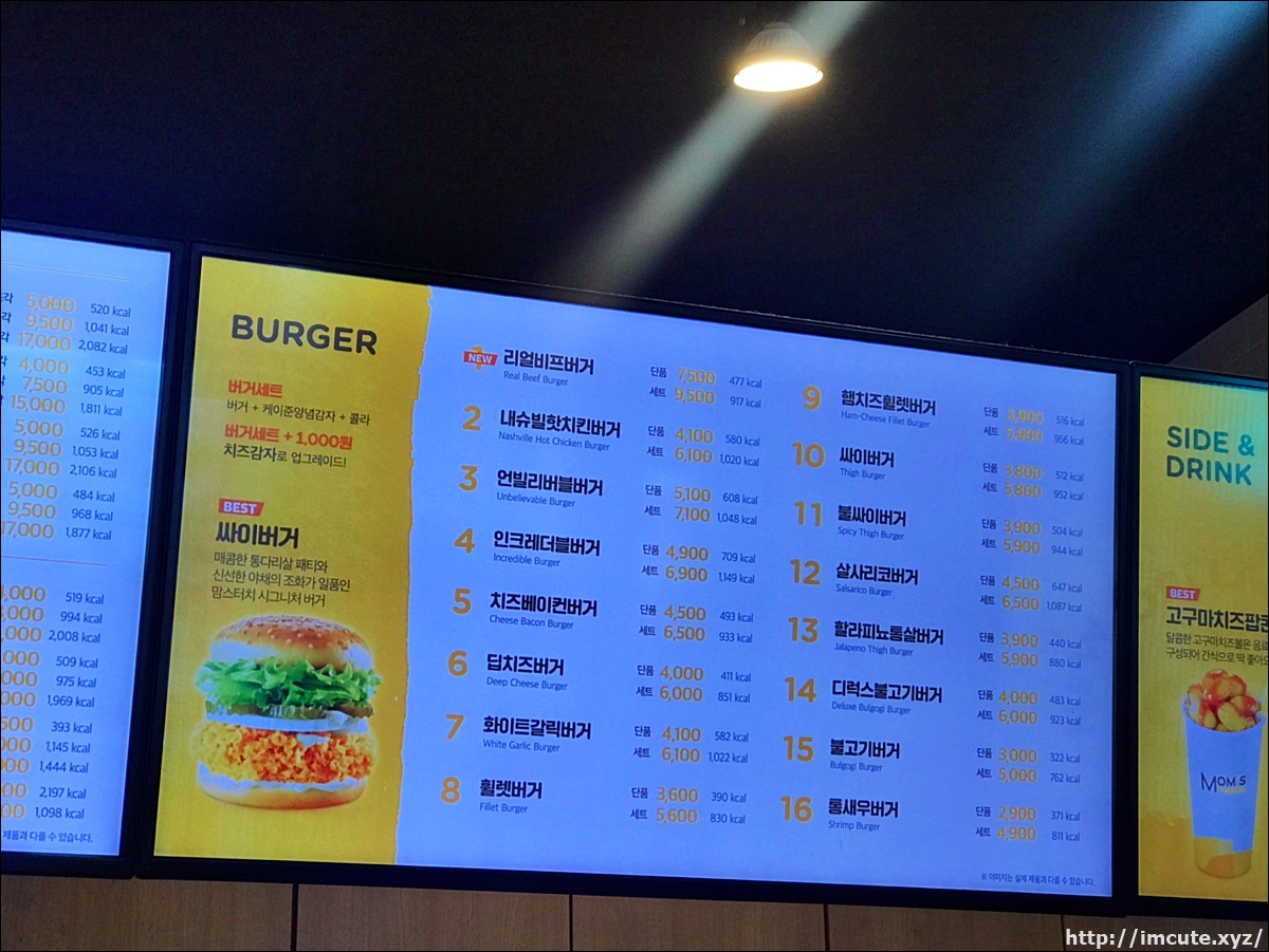 맘스터치 버거들입니다. 칼로리까지 나와있는데 생각 안하고 먹어야지요(...)
