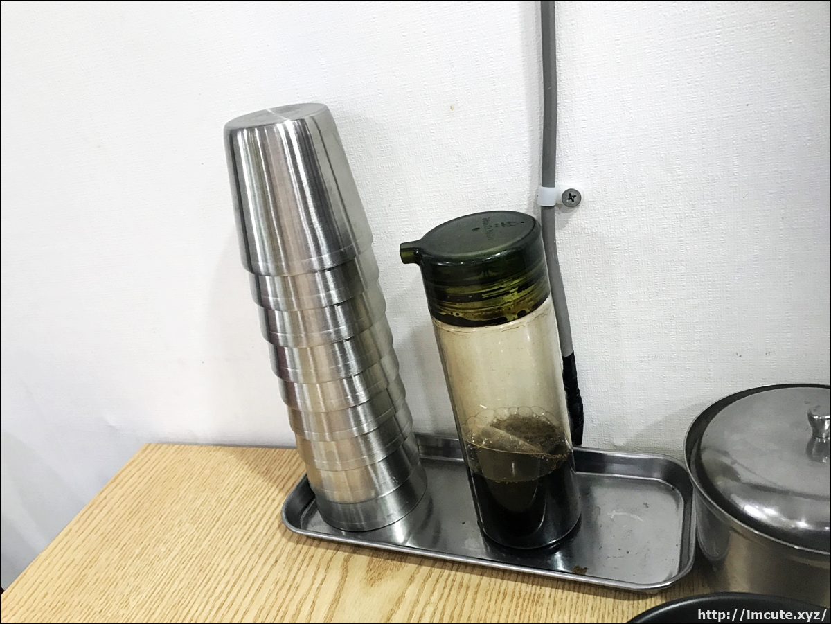 식탁에는 간단한 중국 고추기름과 함께 중국 식초와 컵이 있습니다.
