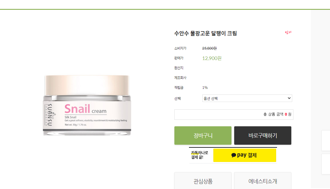 수안수 물광고운 달팽이 크림이 제품명이고요, 소비자가는 25000원이었지만 할인하여 현재 12,900원이네요. 카톡하나로도 결제가 가능한 세상이니 고민 하지 말고 바로 지를수도 있습니다. 하단에 구매처 링크 해놓았습니다.