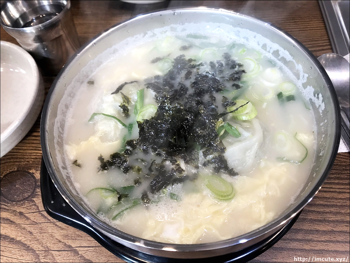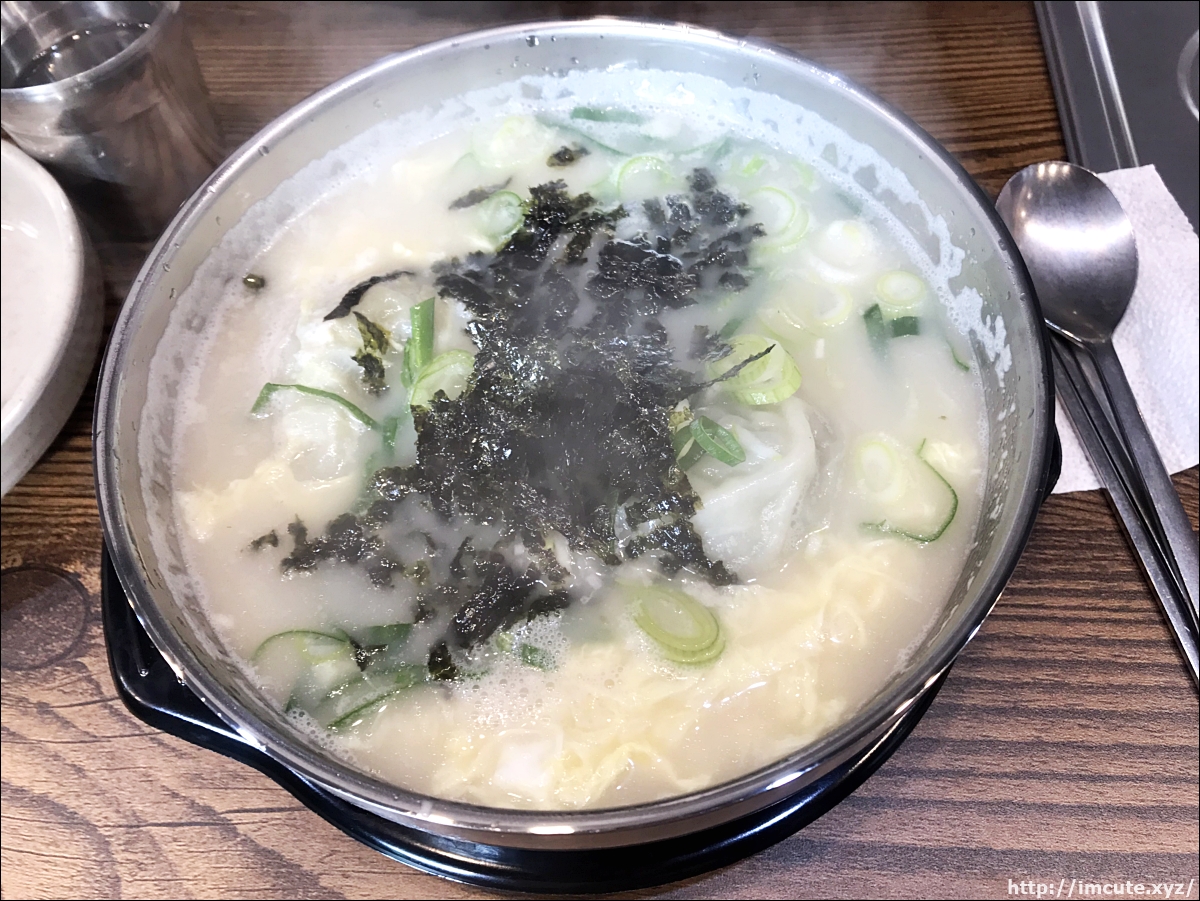 이거는제가 먹은 떡만둣국입니다. 계란이 풀어져 있고 만두가 큰게 똬앟! 2개씩이나 들어 있더군요. 육수에 풀어진 계란이 들어있는 게 너무 좋았어요. 굉장히 야들야들하고 국물에 밥 말아먹어도 간이 딱 맞지만 양이 많아서 이날은 그렇게까진 많이 안먹었네요.