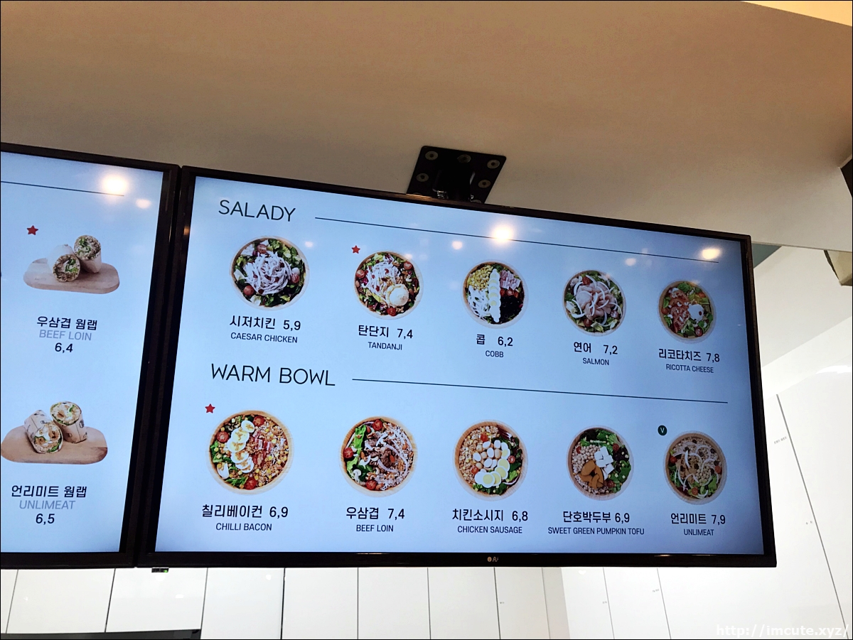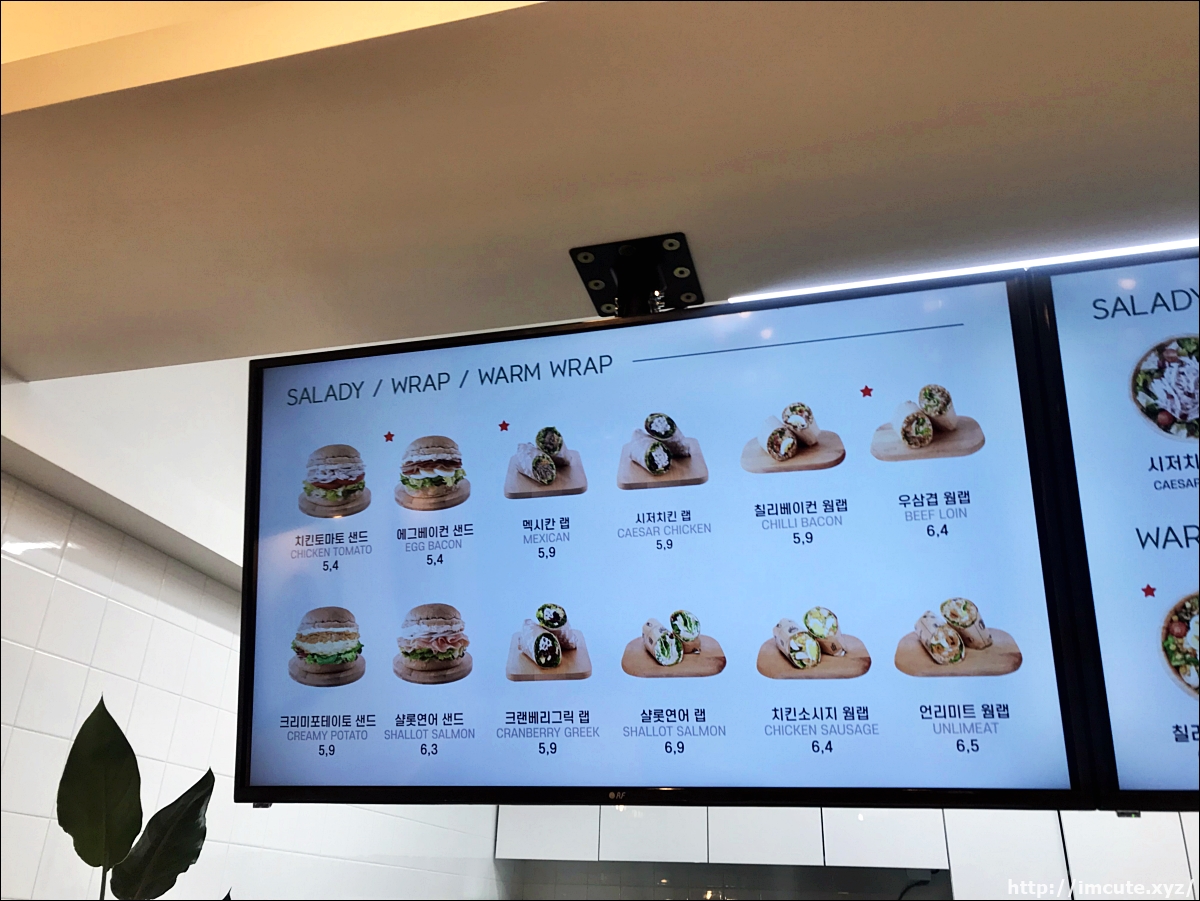 건강해 보이는 메뉴입니다. 샌드부터 롤, 웜랩 등이 있습니다.
