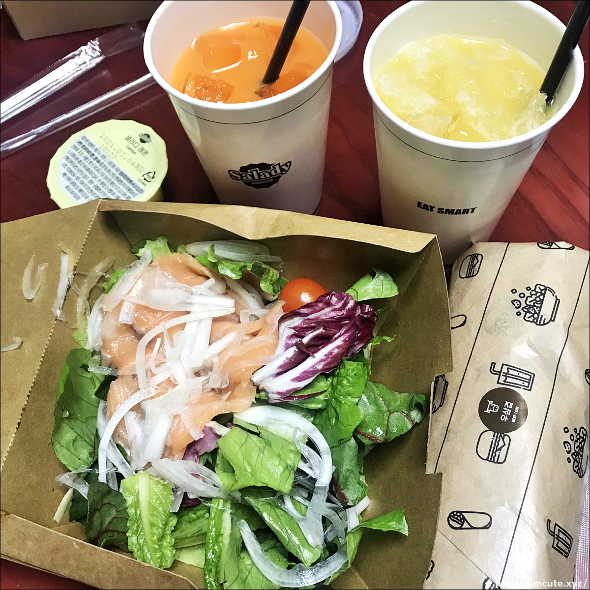아주 근사하지 않나요? 전 랩이랑 샐러드 위주로 포장해왔습니다. 저는 연어(salmon)을 너무 좋아해서 이렇게~. 드레싱도 같이 주시는게 감격적입니다. 커피를 포장해 올까 하다가 건강음료로 택했는데요 다음엔 커피를 꼭 먹어봐야겠습니다.