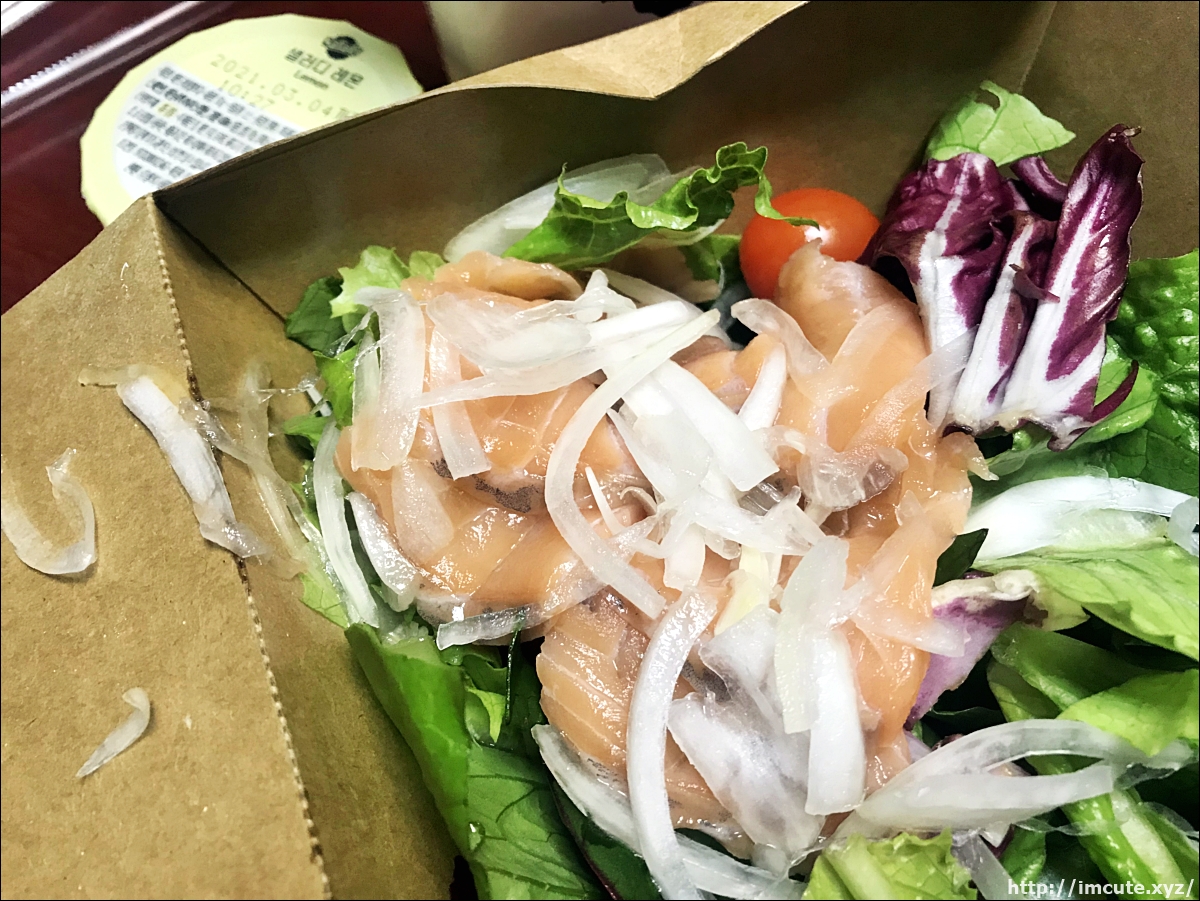 이 세상에 나쁜 연어는 없답니다! 얼마나 맛이 착하던지요. 아삭아삭한 양파가 식감을 더 돋궈주는데요 이대로 먹어도 맛있지만 드레싱을 곁들여 먹으면 또 다른 맛이 난답니다.