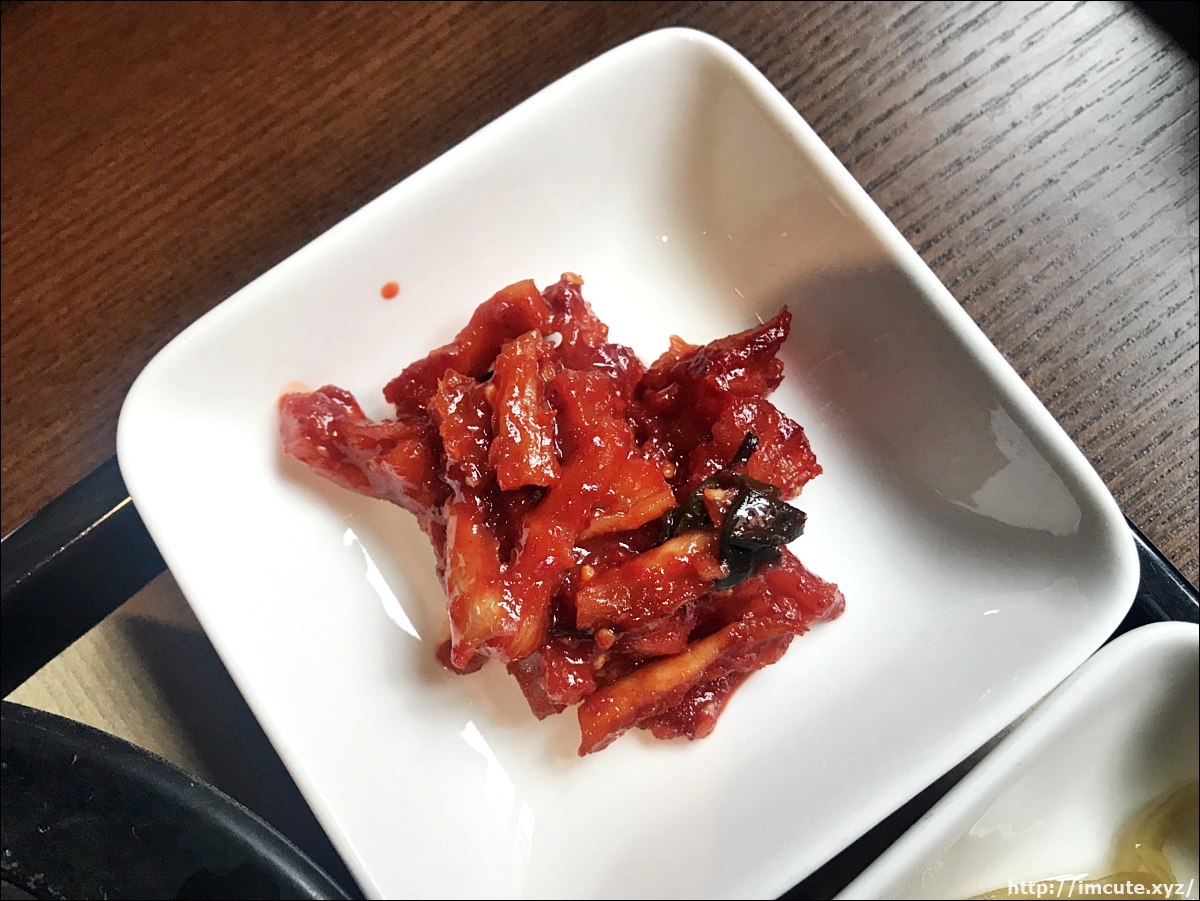 첨엔 젓갈인가 했는데 무말랭이더라고요. 입안에서 꼬들꼬들하게 씹히고, 빨간 양념이 맛깔났어요.