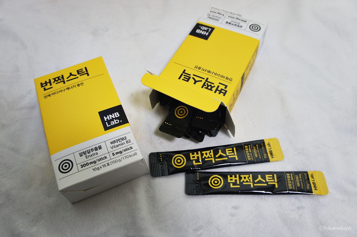 일단 HNB Lab이라고 써있고요, 노란빛이 마음에 들더라고요. 커피로만 끙끙대고 있는데 졸릴 때 번쩍스틱 하나 먹어주니 향이 좀 진하고 해서 요긴하게 섭취해 주고 있어요. 뭔가 정말 한 포 짜 넣어보면 엄청 시거든요. 근데 잠이 확 깬답니다.