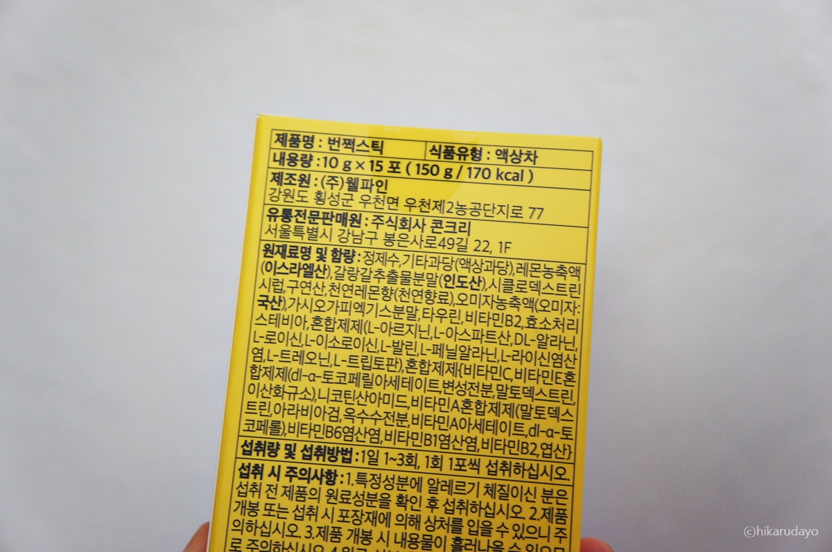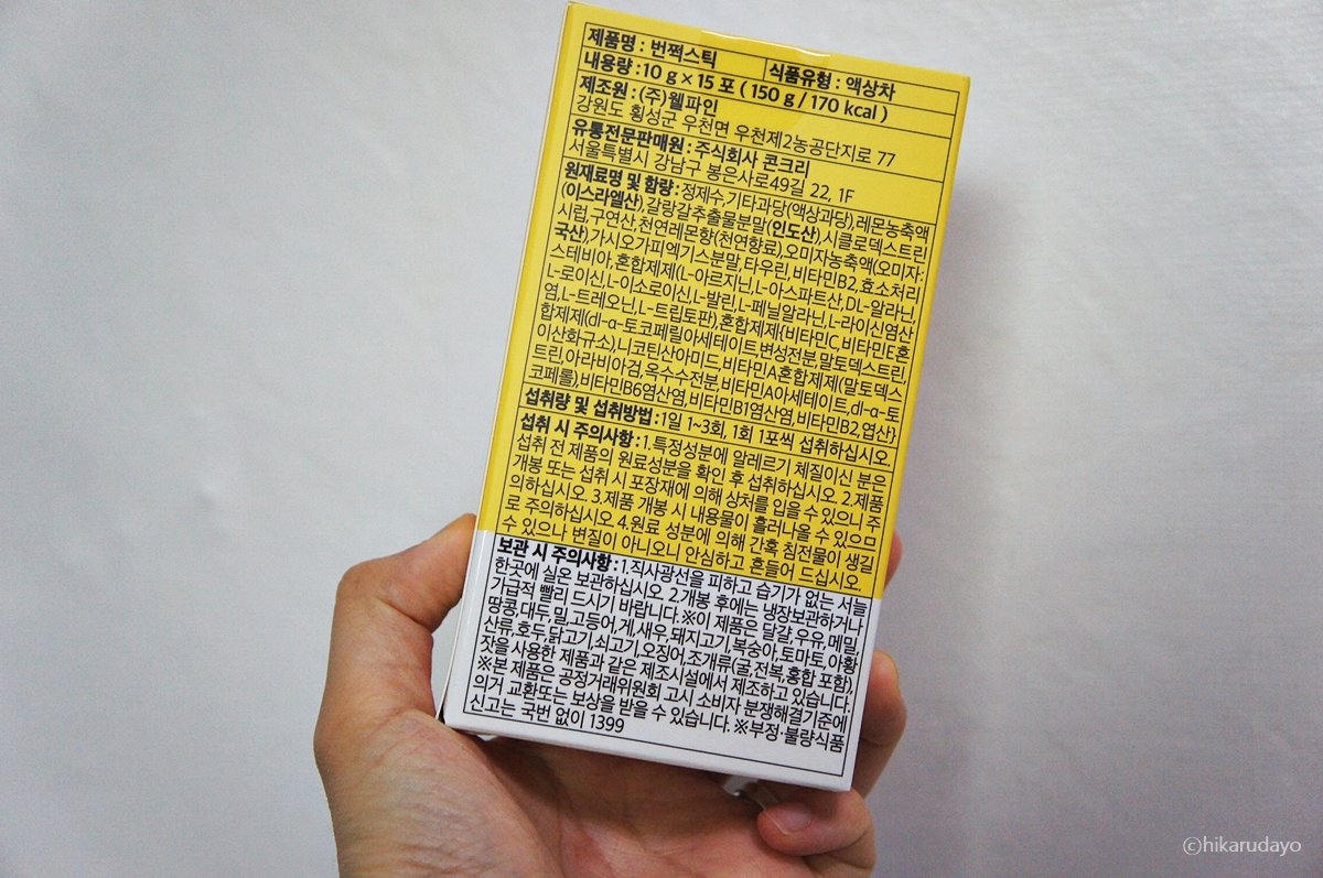 생각보다 굉장히 작은 수험생 비타민 번쩍스틱인데요, 10g씩 15포가 들어있습니다. 150g 다먹으면 칼로리는 170kcal인데, 작아서 칼로리에 신경을 안쓰고 드셔도 될거 같습니다. 이정도면 말이죠~