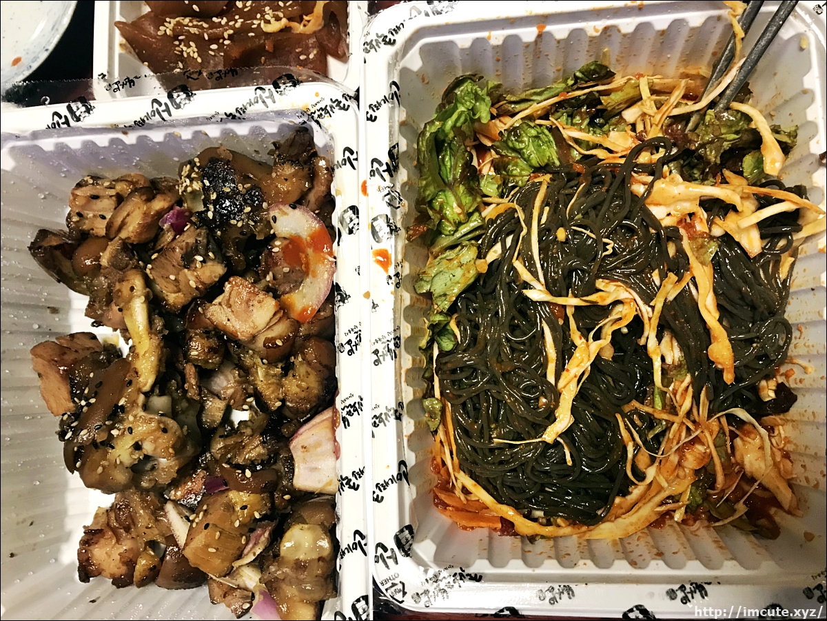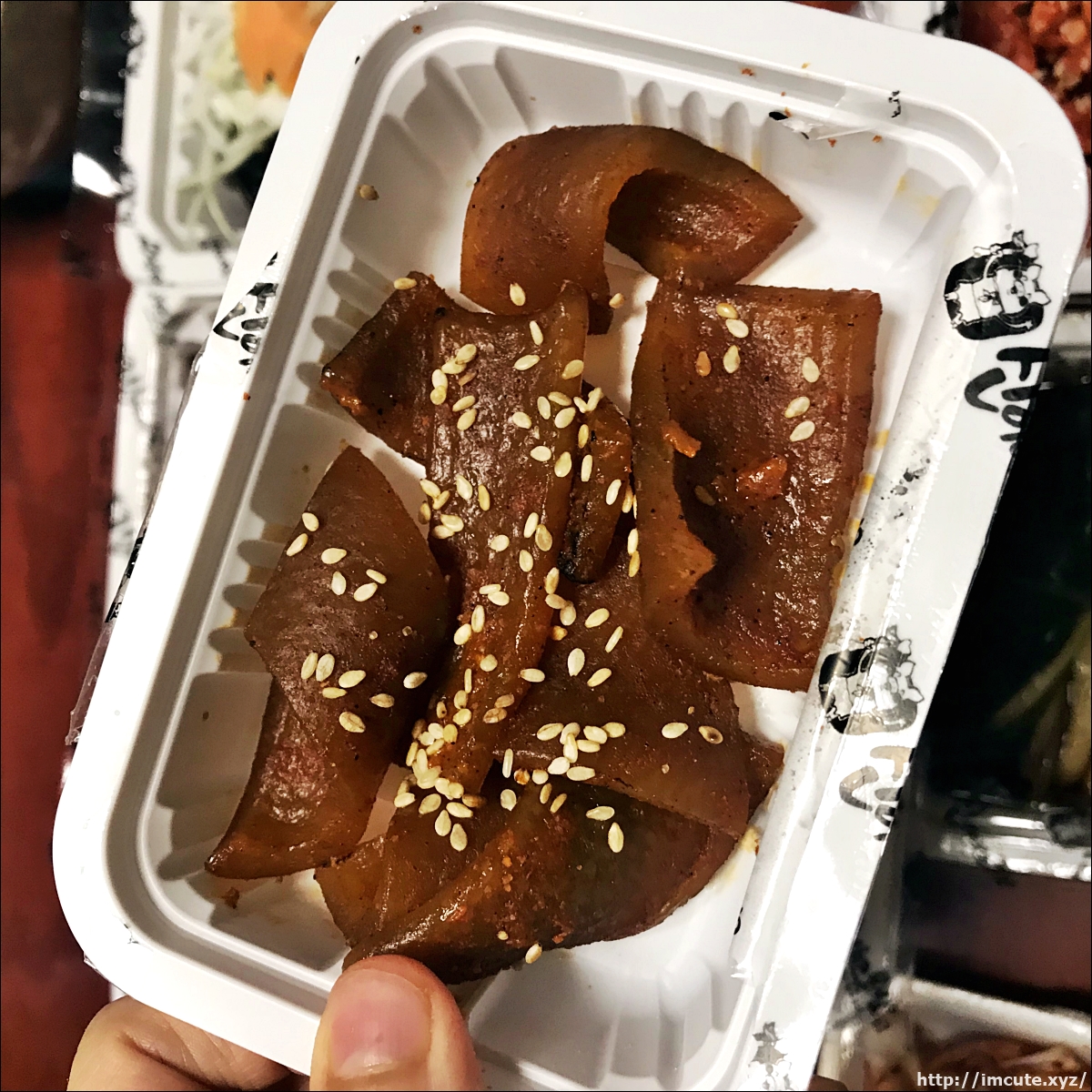 전자렌지에 살짝 돌려 먹는 돼지껍데기의 맛도 엄청났다고 합니다. 족발 시킬 때 이런거 주는 건 또 처음 보네요. 쫀득쫀득 맛이 좋습니다. 불판에 구워 먹지 않아도 이런 맛이 다 나는군요. 이미 한 번 익혀져서 나온거라 그런가봐요. 역시, 잡내는 제로입니다.