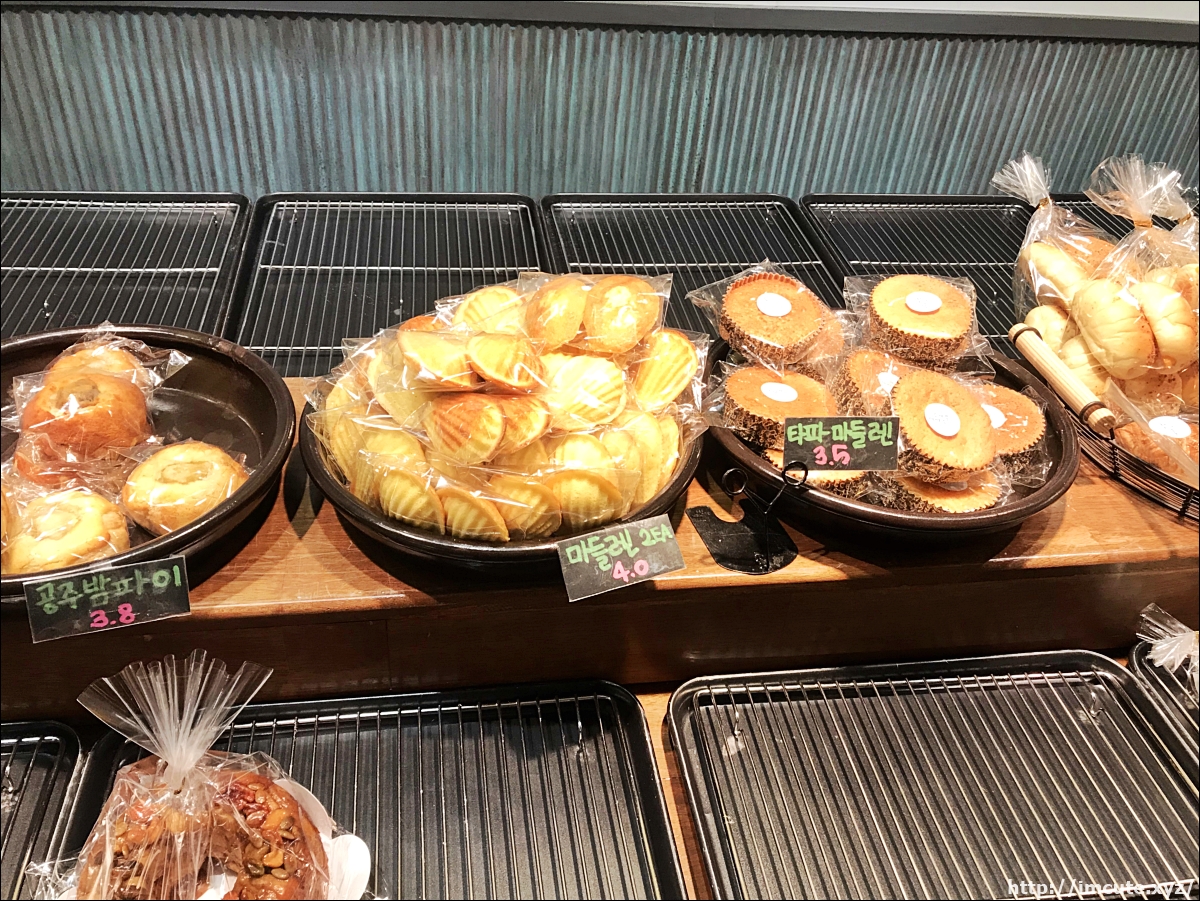 그 외에도 마들렌 같은것도 보이고 여러가지 모양의 빵이 개별로 미리 포장된 모습이었어요.