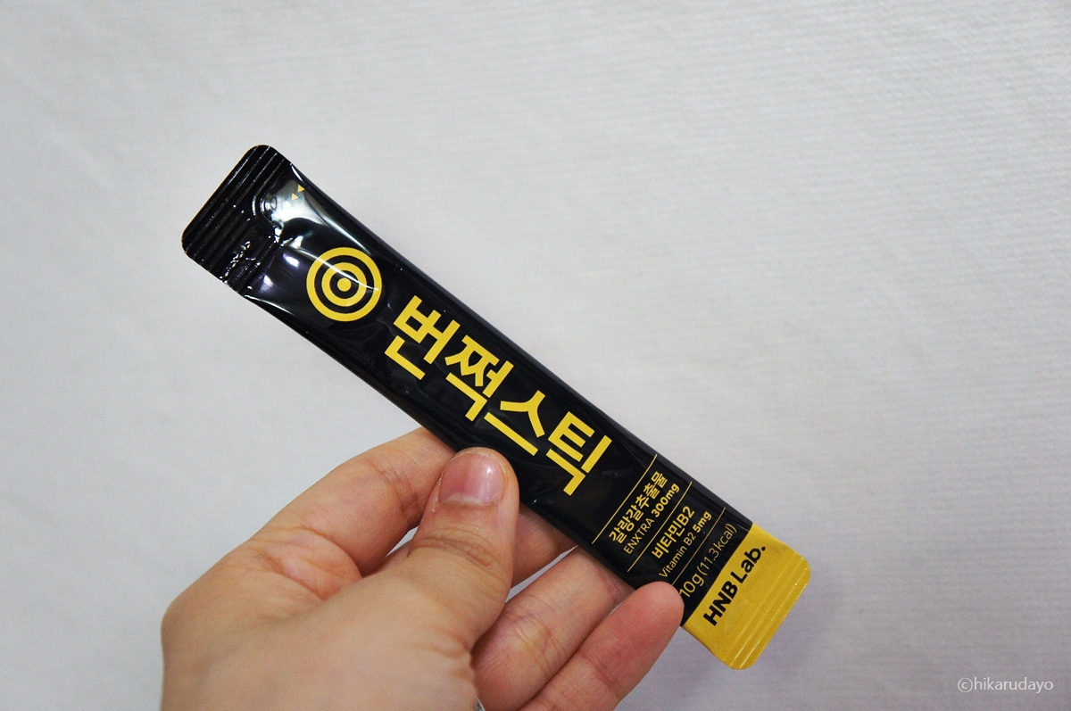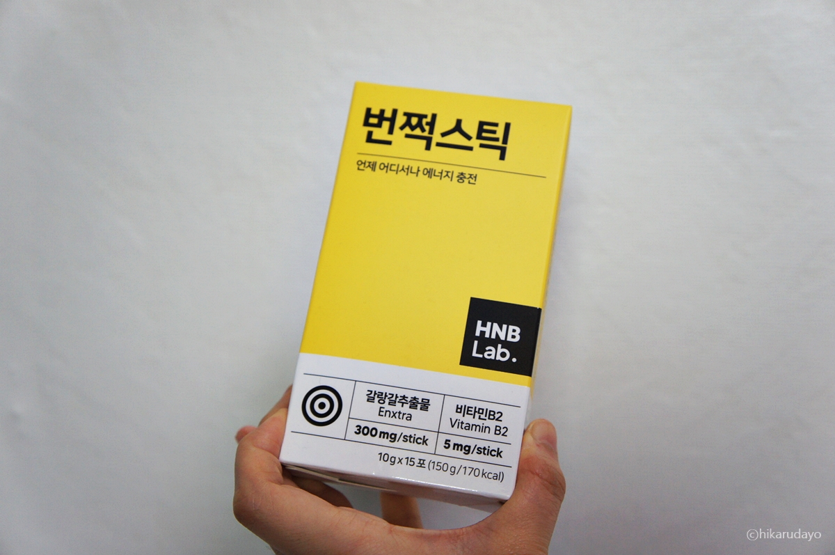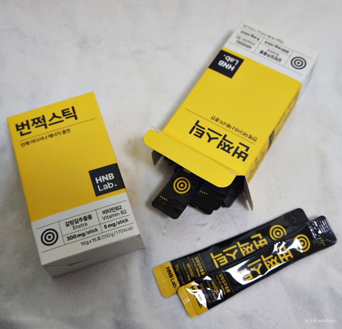 일단 HNB Lab이라고 써있고요, 노란빛이 마음에 들더라고요. 커피로만 끙끙대고 있는데 졸릴 때 번쩍스틱 하나 먹어주니 향이 좀 진하고 해서 요긴하게 섭취해 주고 있어요. 뭔가 정말 한 포 짜 넣어보면 엄청 시거든요. 근데 잠이 확 깬답니다.