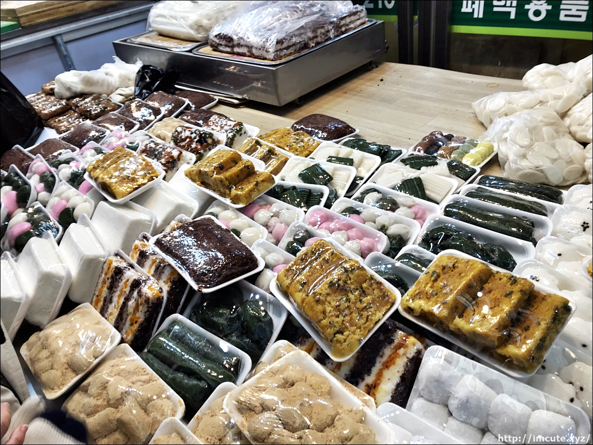 떡집에서 갓 뽑아낸 떡도 종류별로 있었습니다. 사람들이 많이 사러 왔던데요 제가 좋아하는 콩고물이 가득 묻은 인절미라든가 꿀떡류, 백설기, 술빵이 있었습니다. 약밥도 보이고 새해 먹기좋은 떡국떡도 파네요. 갑자기 떡국 끓여먹고 싶어졌어요.