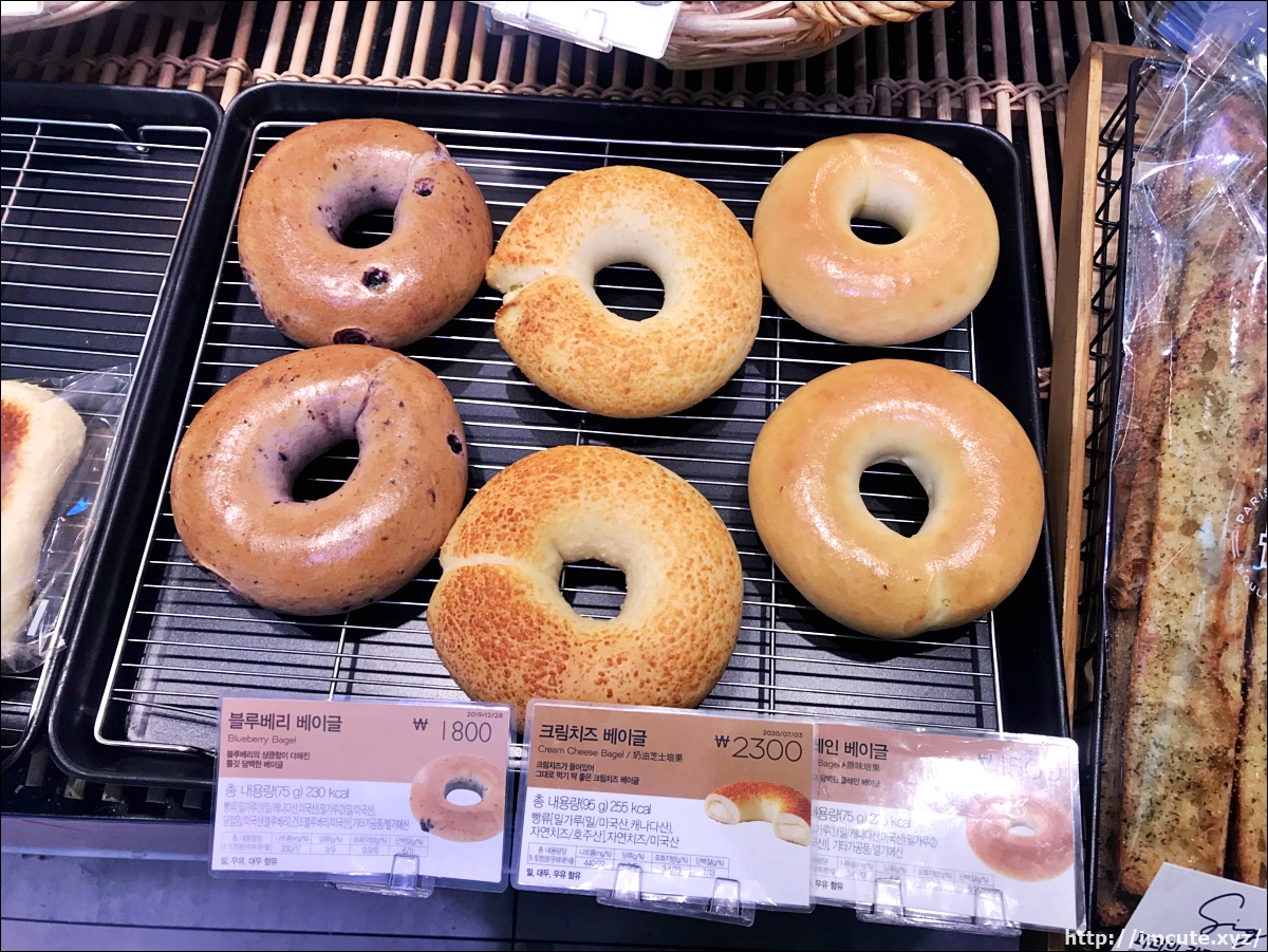 색이 살짝 보라색인것은 블루베리 베이글이고 가격이 1800원입니다. 살짝 그을린 모양새의 먹기좋아보이는 크림치즈 베이글도 있어요.