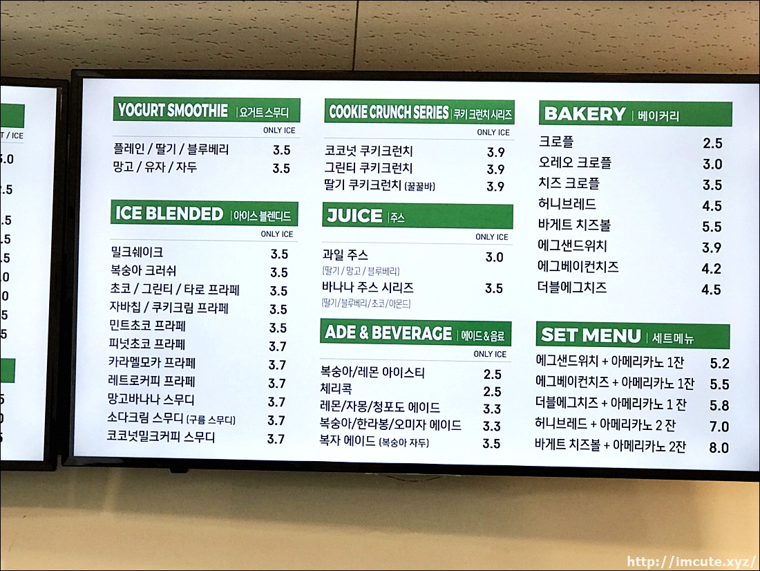 커피, 콜드브루, 우유, 티, 기타메뉴, 요거스트무디, 아이스블렌디드, 쿠키 크런치 시리즈, 주스, 에이드, 베이커리, 세트메뉴도 있어요.