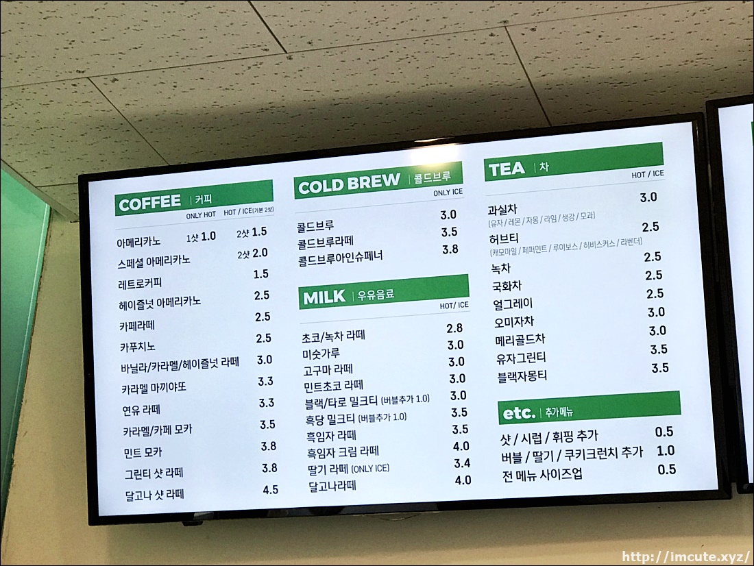 초록색 바깥 분위기가 예사롭지 않았고 아메리카노 가격이 천원이라고 해서 좋았어요.