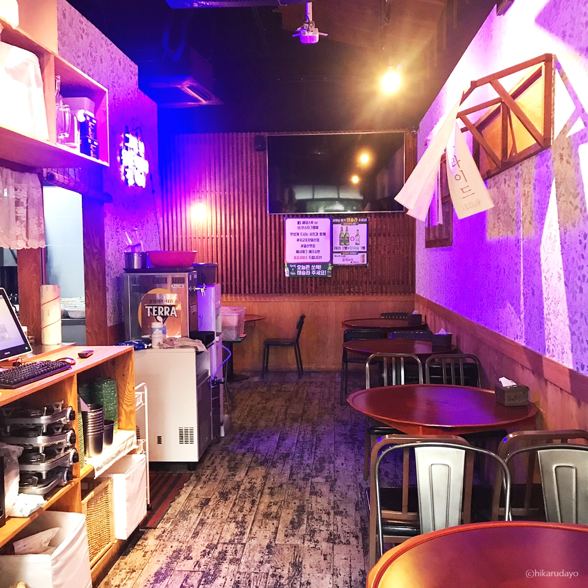 내부 분위기는 편안한 느낌,그리고 깔끔합니다. 요즘 세대의 니즈에 맞춰 굉장히 트렌디한 면모를 뿜어내는데요 그중에서도 옛날 평상 느낌의 식탁은 정말 특이하더라고요. 동생에게 보여줬는데 우리 집에 있는 상이랑 비슷하다며 웃더라고요. 네온사인의 분위기가 아주 현대적이면서도 모던하고 쉬크하였습니다. 현대와 과거의 공존이랄까요(...) 아무튼 마음에 들었습니다. 저희는 구석에 자리를 잡고 앉아주었고요~ 상가에 화장실이 가까워 술먹기 편하답니다.