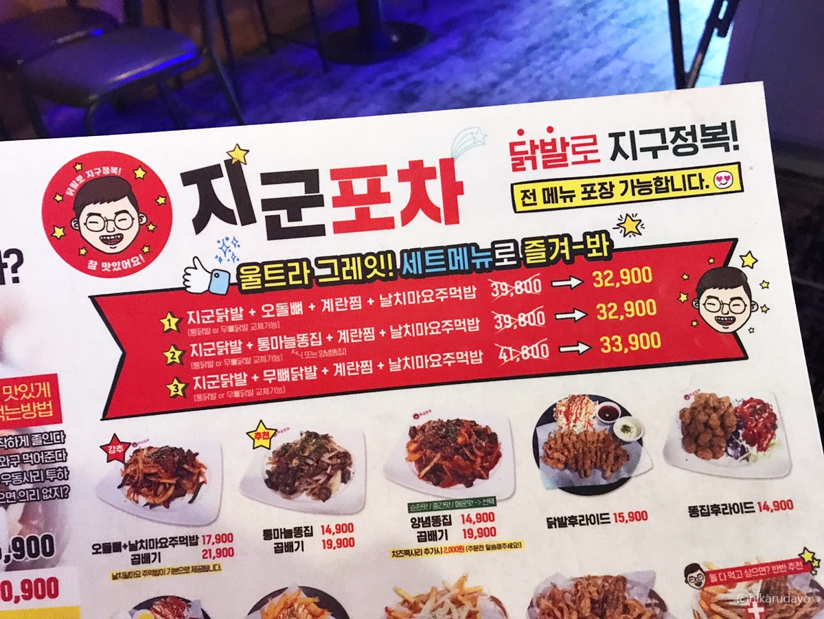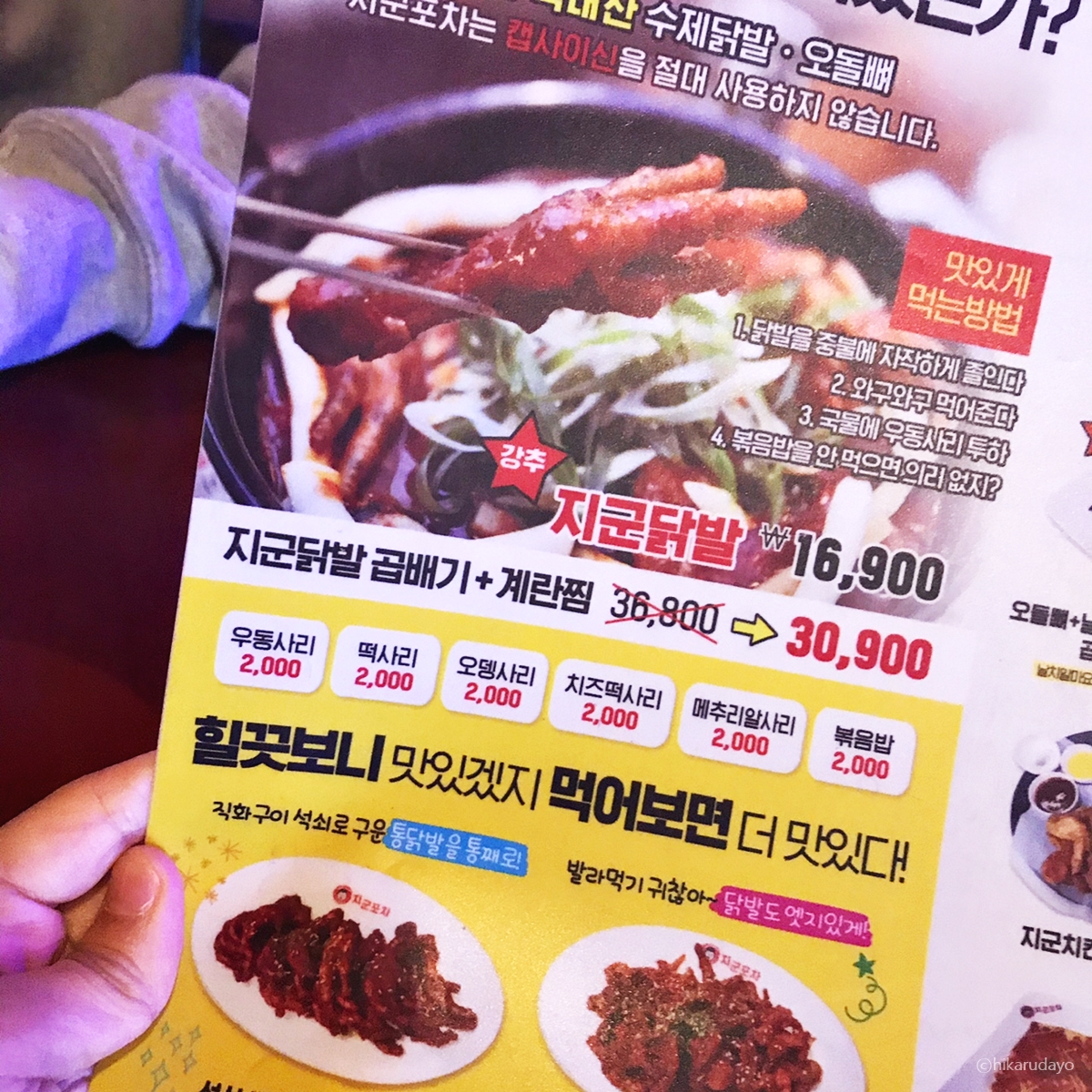 먼저 메뉴판 스캔부터 해야지요, 닭발만 있는 줄 알았는데 사이드메뉴가 다채롭습니다. 저거, 감자튀김까지 있는거 실화인가요. 여러가지가 있는데 지군포차는 참 대단한 곳인거 같아요? <전 메뉴 포장가능>이라는 문구가 왜 닭발로 지구정복을 하고 싶다는지 알겠습니다.