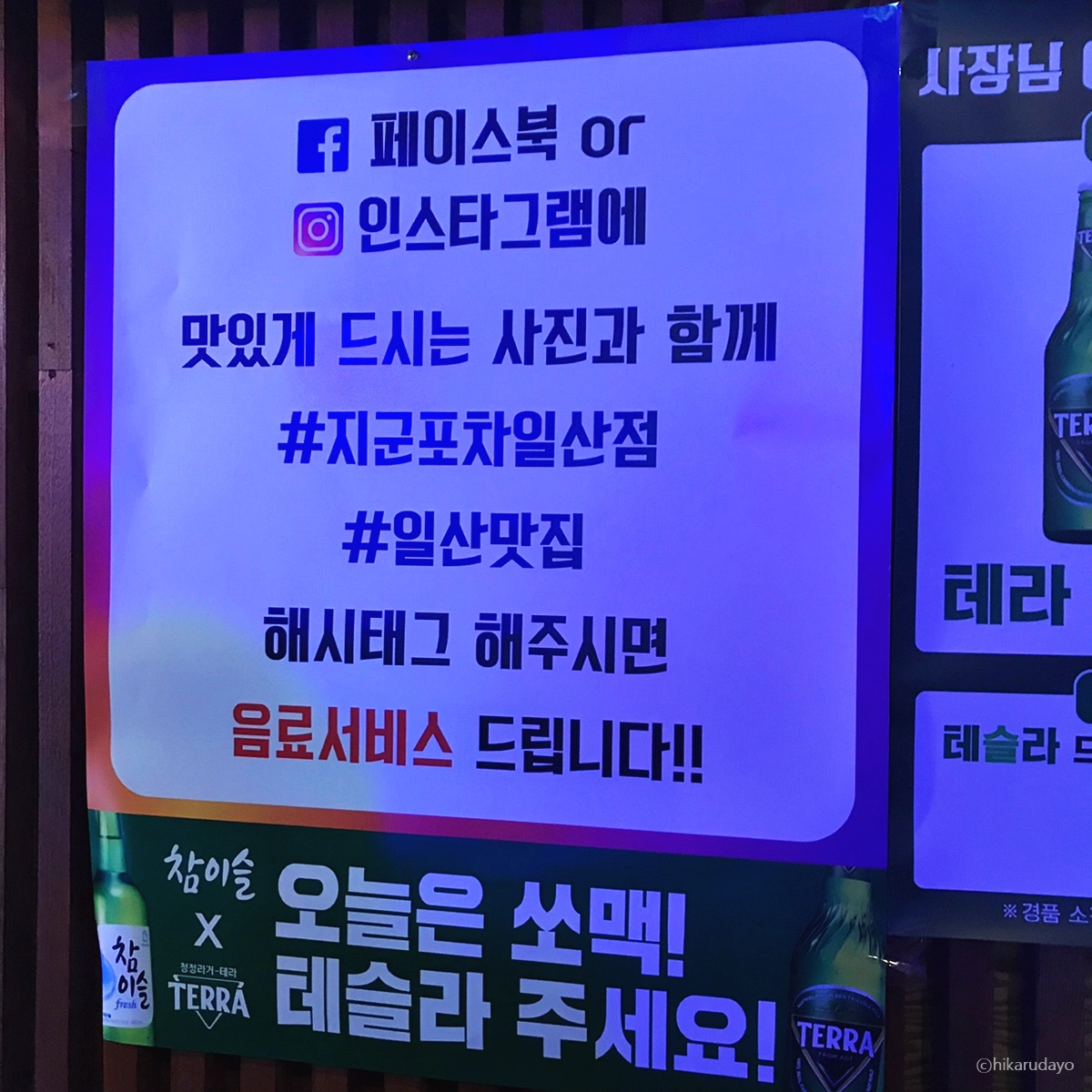 페이스북 또는 인스타그램에 #지군포차일산점 이라고 해쉬 태그를 달아 올리면 음료도 받을 수 있다 하네요, 저도 다음에 가서 이 이벤트는 꼭 참여해야겠어요. 사장님이 정말 닭발에대해 일가견이 있으신 분 같습니다. 닭발 먹어야지 먹어야지 하면서 기회가 없어서 불닭볶음면 라면만 끓여먹다가 간만에 여기 오니까 너무 행복했어요.