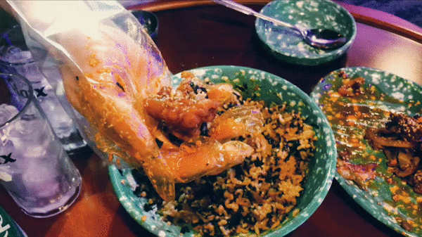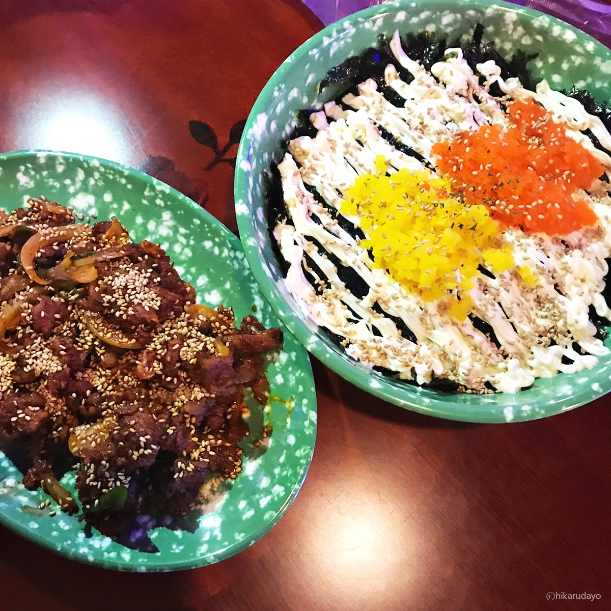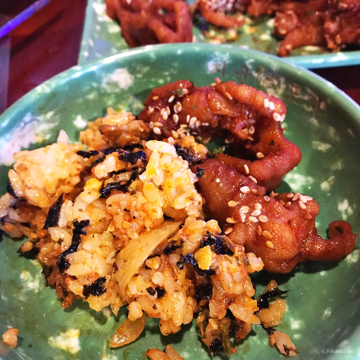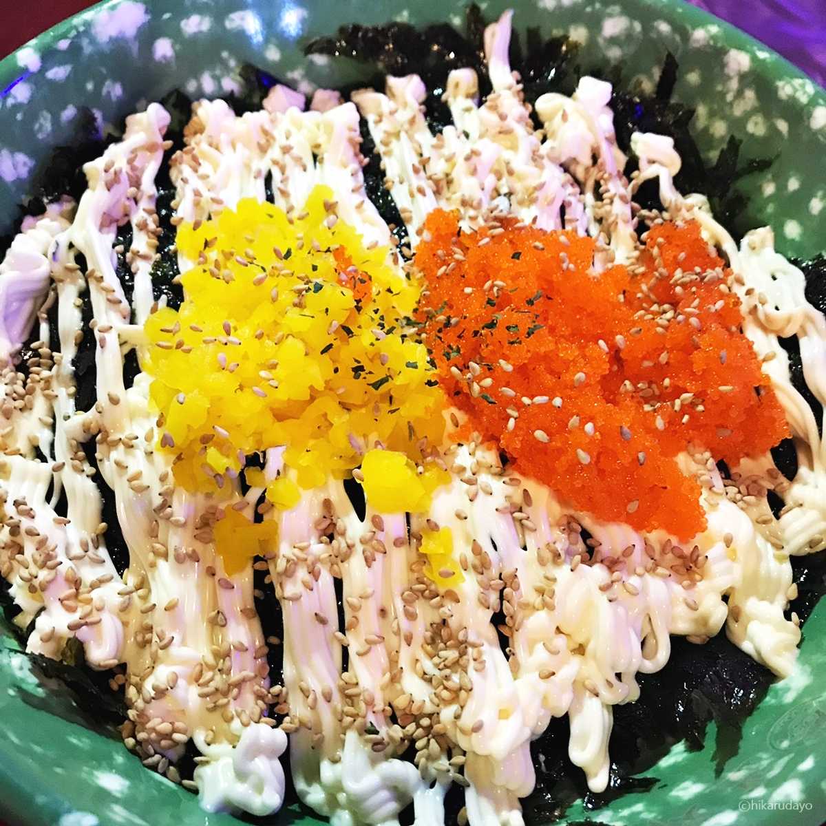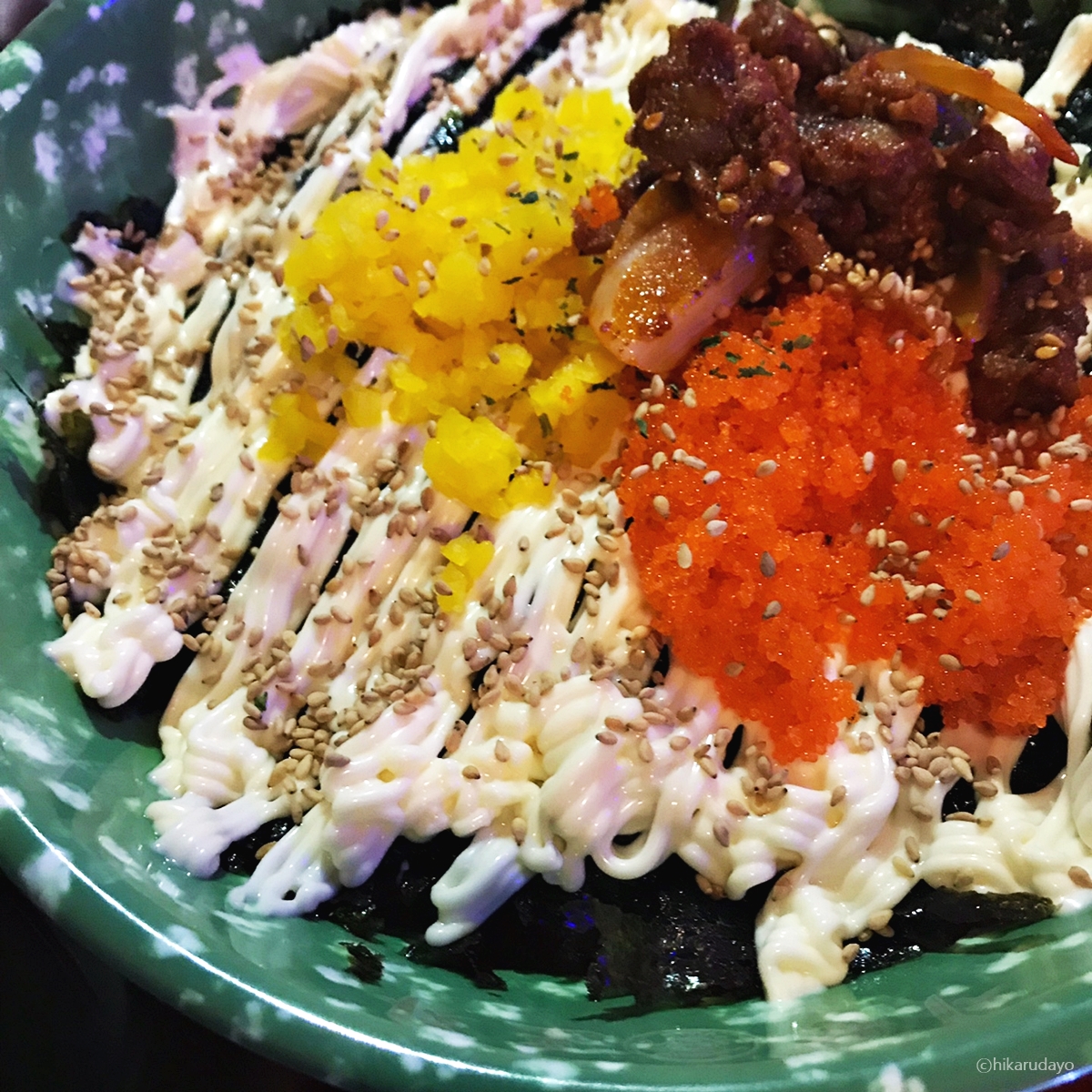 옛날 떡볶이 그릇에 담아주신다는. 그래서 포차 느낌이 물씬인데요, 마요네즈가 얹어진 주먹밥위에 오돌뼈를 뿌려서 비벼서 섞어주는거에요. 그러고보니 씹히는 맛이 좋다 했는데 날치알이랑 단무지가 들어있네요. 단무지는 작게작게 썰려있어서 식감이 상당했습니다.