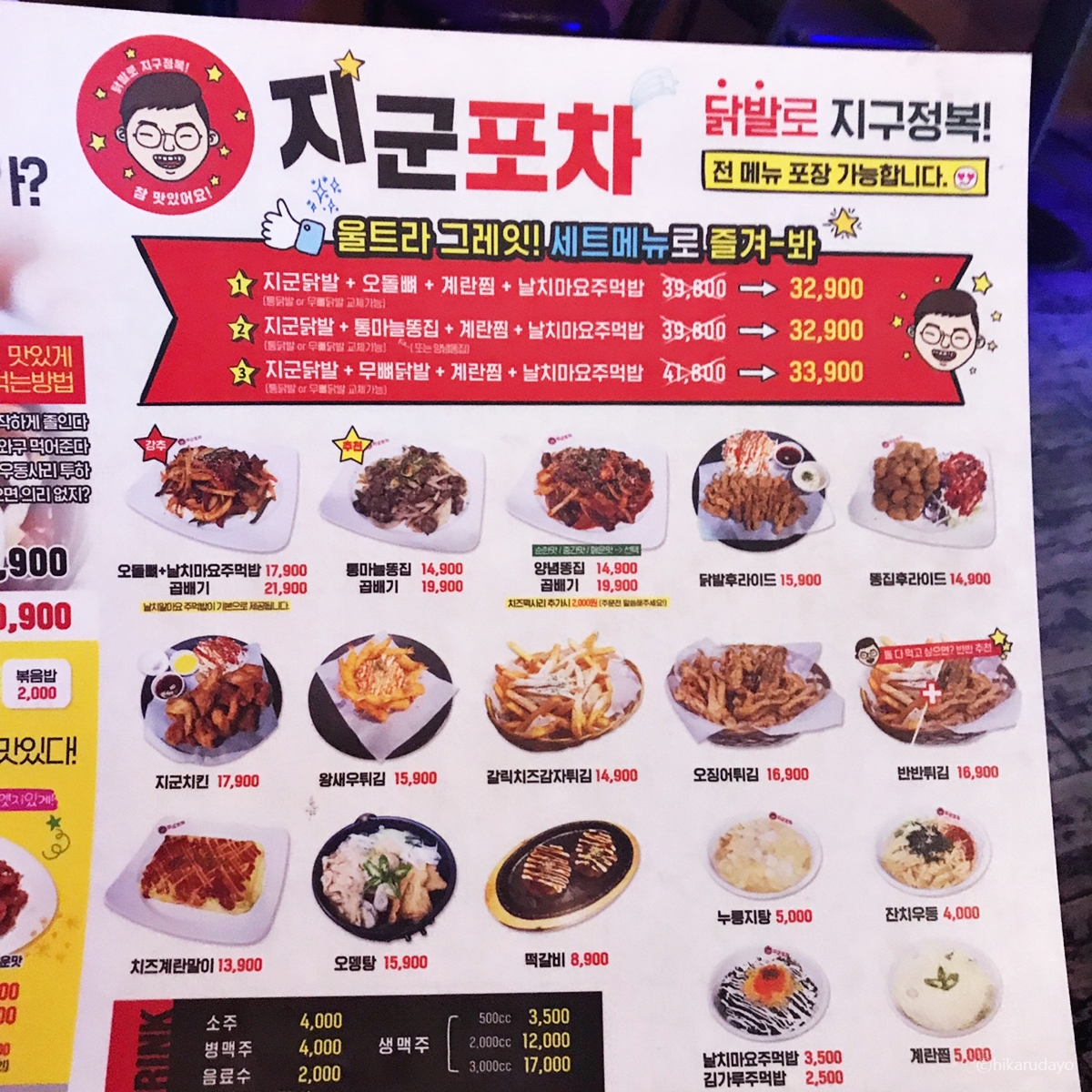 일산 닭발 맛집답게 여러 메뉴가 있는데요 특히 이곳은 닭발이 유명하다고 합니다. 저는 지군닭발만을 보고 왔는데 오돌뼈라든지 통마늘 똥집 등도 먹음직스러워 보이더라고요. 가격은 저렴한 편입니다.