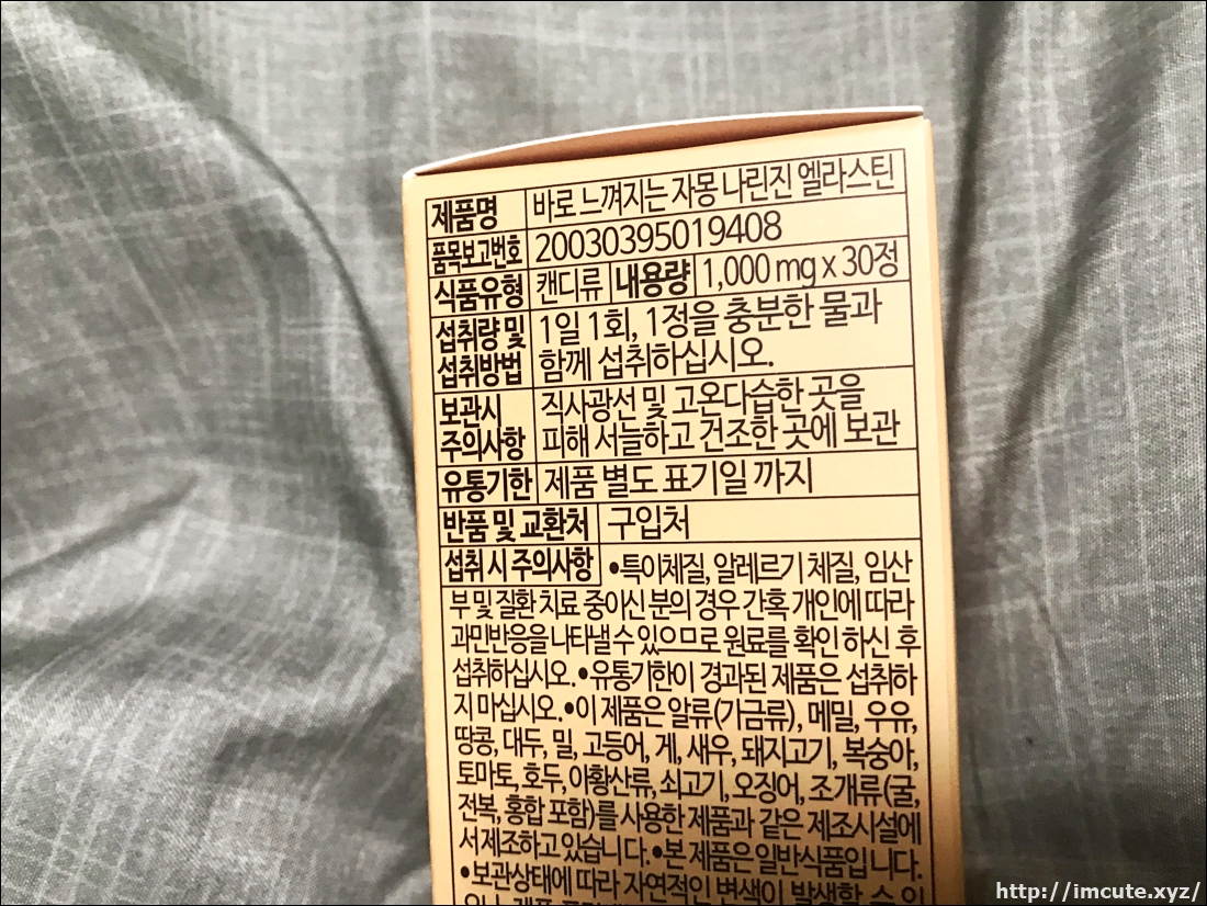 제품명이 바로 느껴지는 자몽 나린진 엘라스틴인데요 엘라스틴이 뭔지 잘 몰랐는데 이렇게 먹는건가봐요! 먹는 엘라스틴과 함께 충분한 물을 섭취하는 제품인데요 아직 효과는 잘 모르겠지만 일단 꾸준한 것이 제일 중요한 것 같아요.