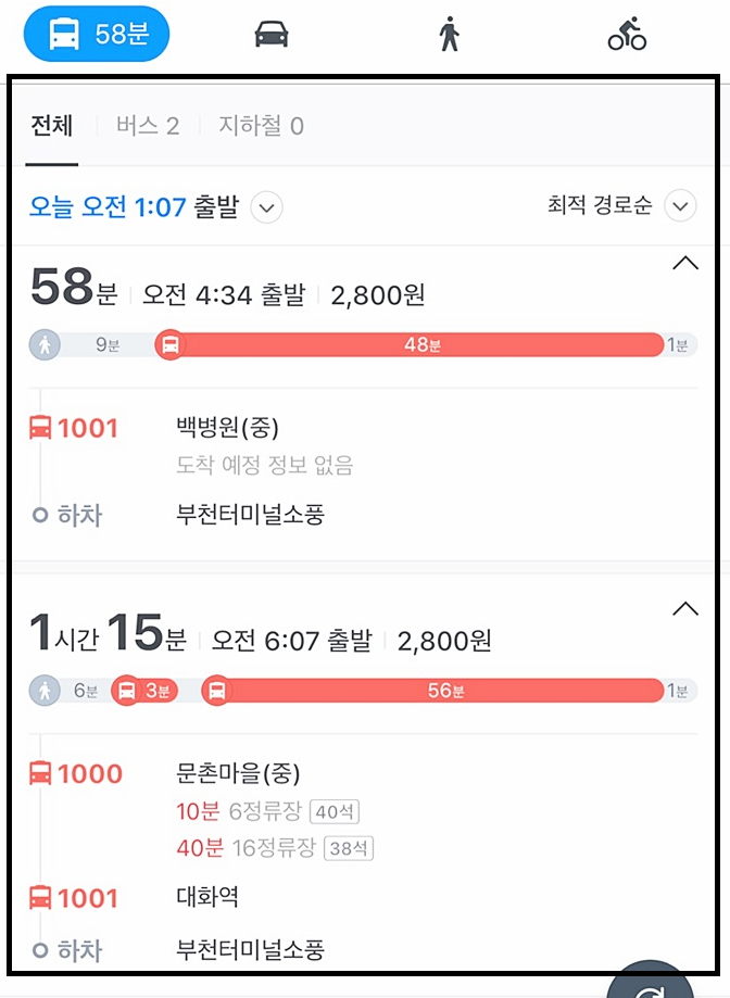 일산 부천 1001번 버스 노선 안내 해드립니다.