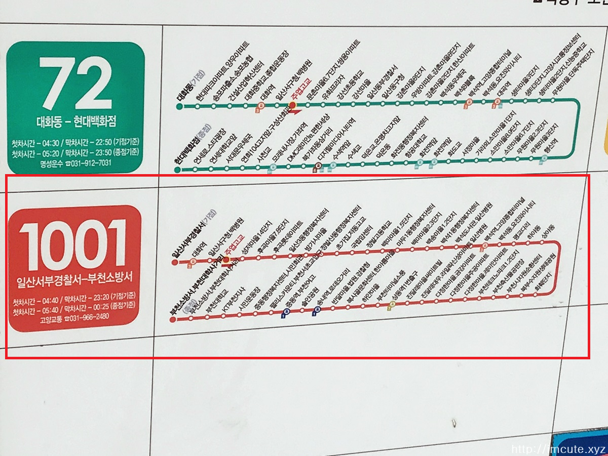 일산 부천 1001번 버스 노선 안내 해드립니다.