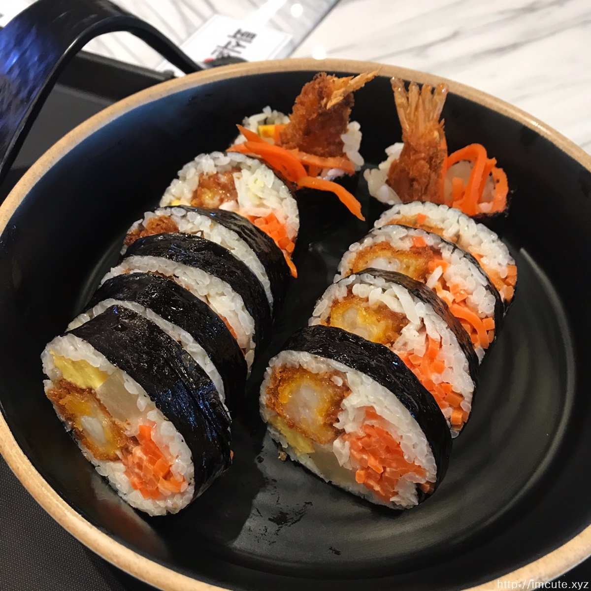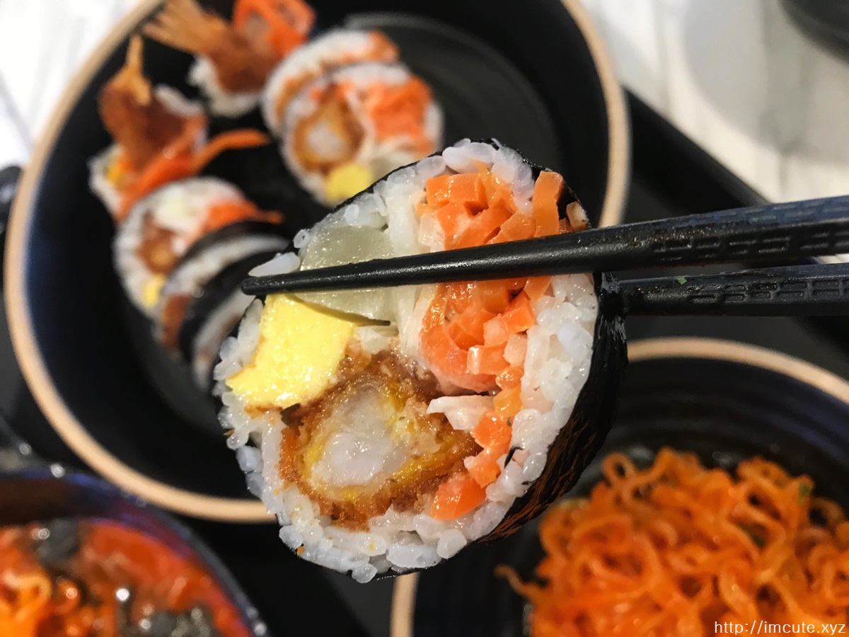 왕김밥 형식의 김밥입니다. 당근이 많이 들어있고 크래미에 새우튀김이 들어있다는 것이 특징이었습니다.