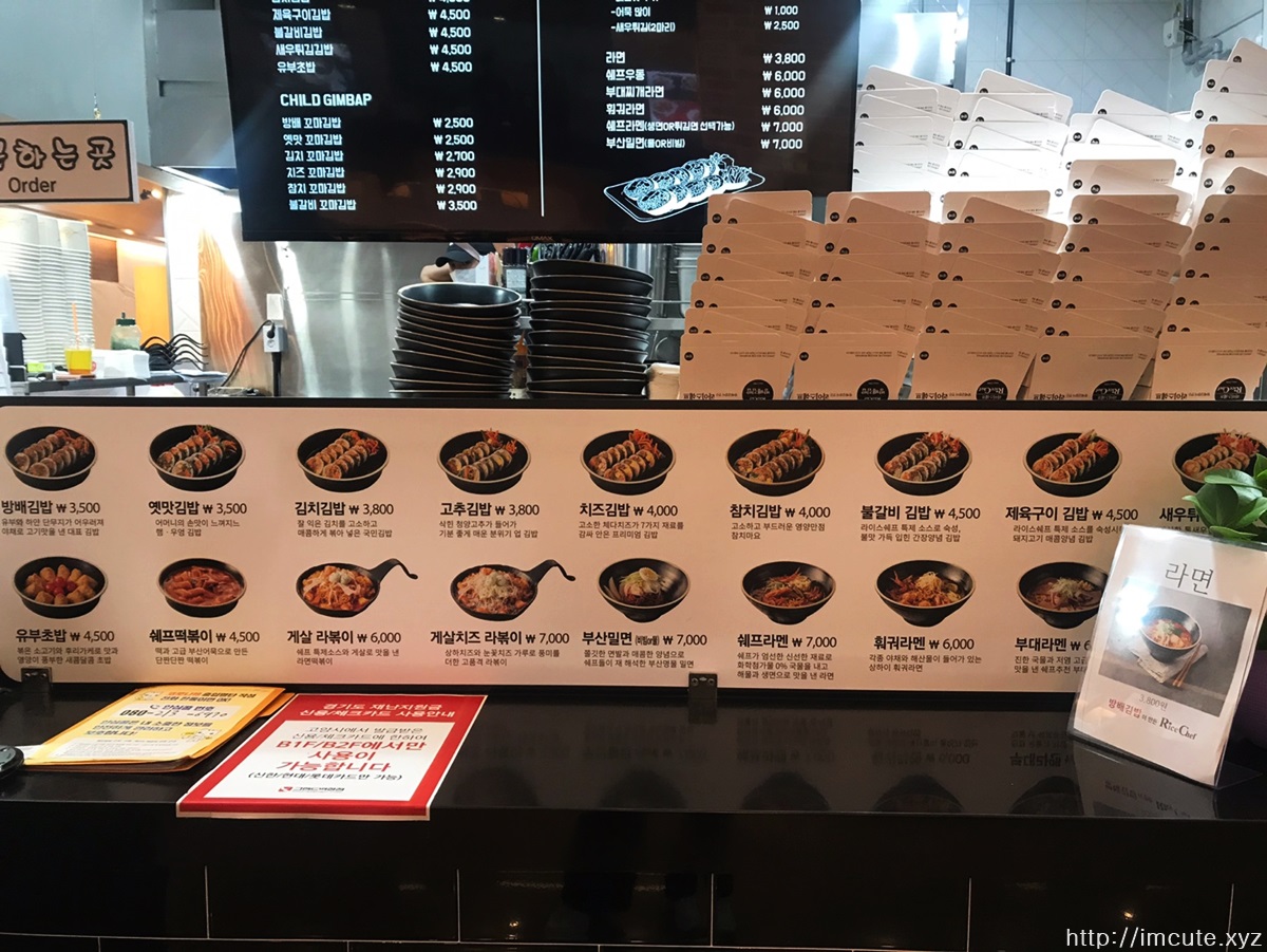 일산 그랜드백화점 식당가에 위치한 방배김밥 메뉴 가격 정보입니다