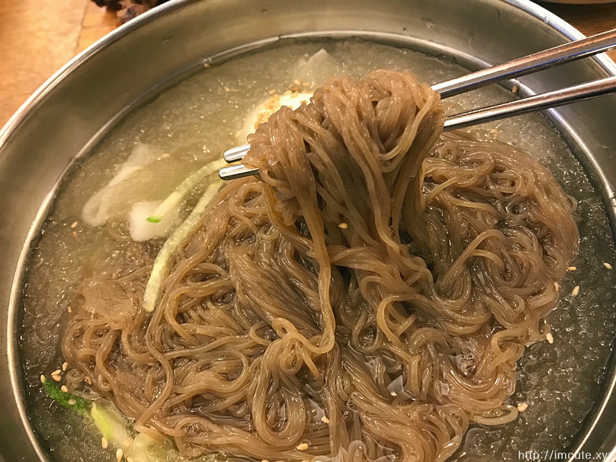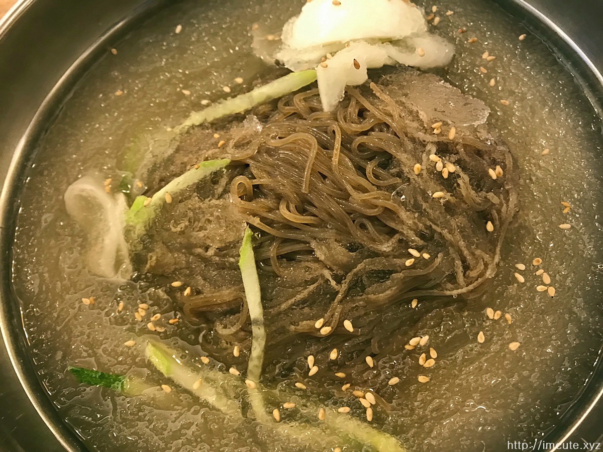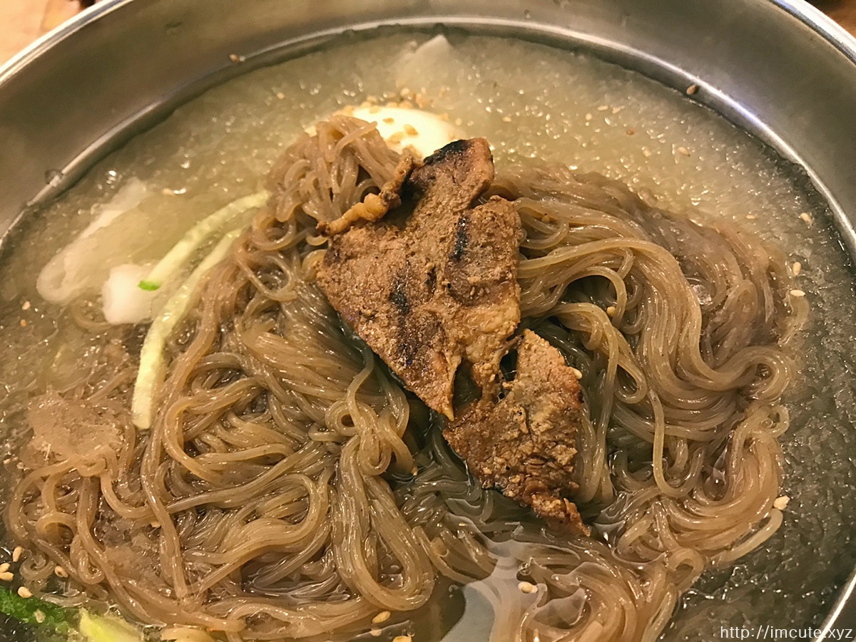 물냉면은 국물이 이렇게 들어있고 오이와 무 초절임 그리고 계란 반쪽이 올려져 있습니다.