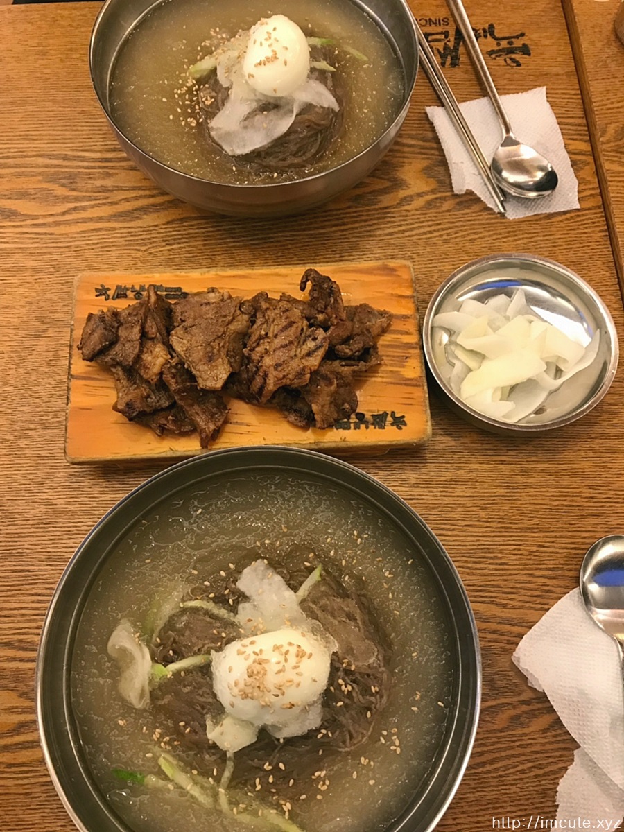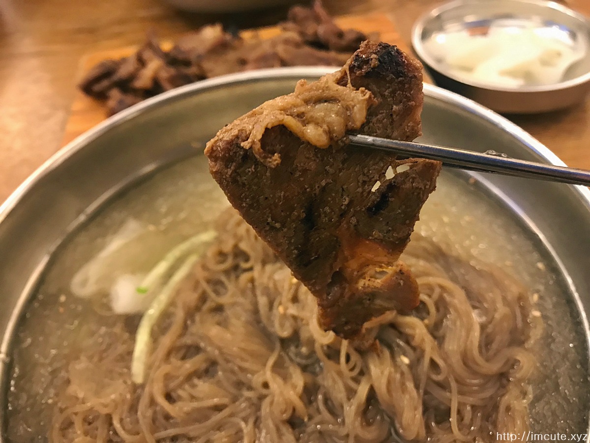 고기 2인분입니다. 숯불에 살짝 그을은 고기이며 불맛이 가미되어 있습니다. 비싸지 않은 고기이지만 불향이 나고 또 따로는 잘 안찾아먹을 거 같은데 냉면이랑은 먹고싶은 맛입니다.