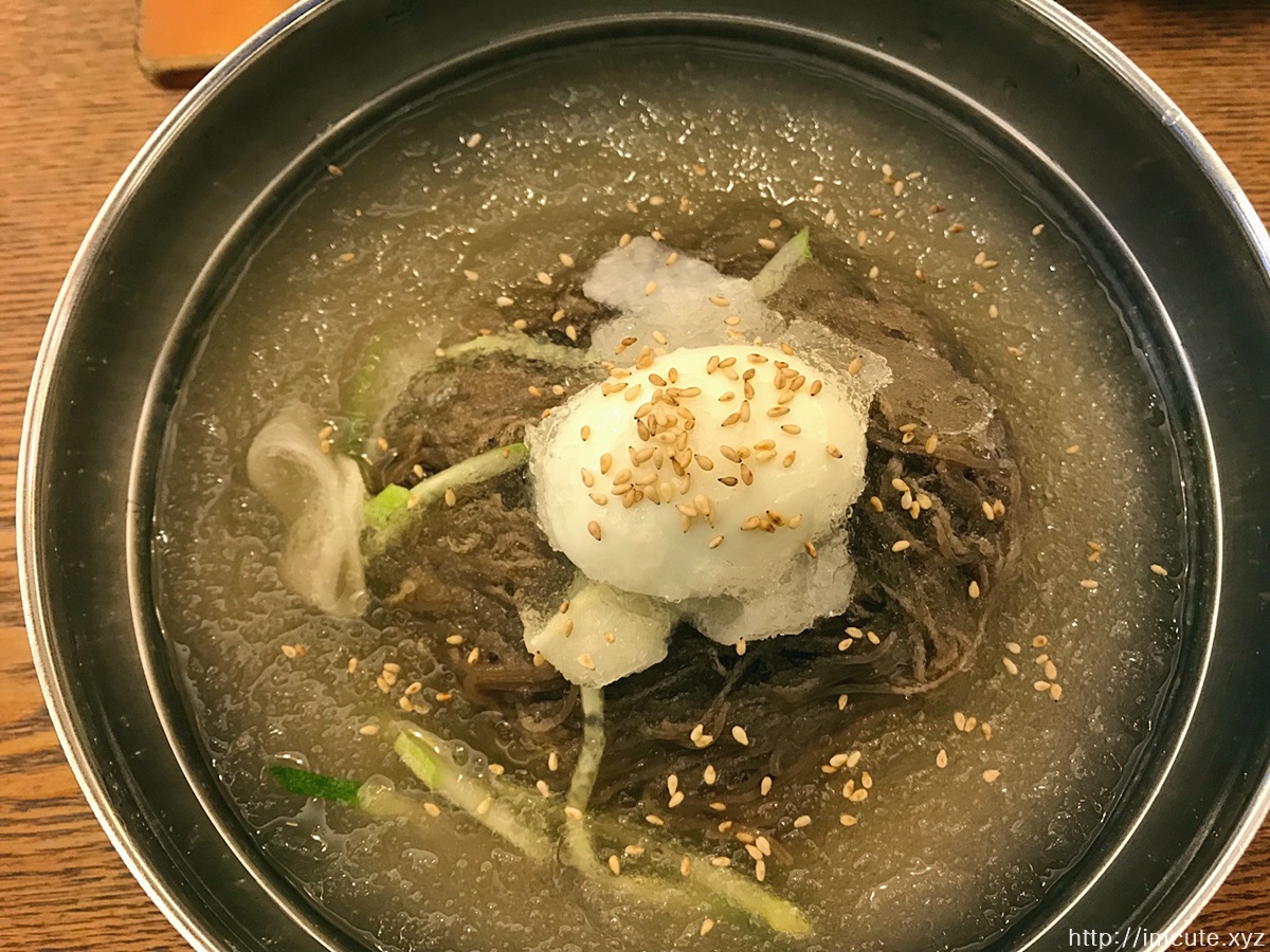 물냉면은 국물이 이렇게 들어있고 오이와 무 초절임 그리고 계란 반쪽이 올려져 있습니다.