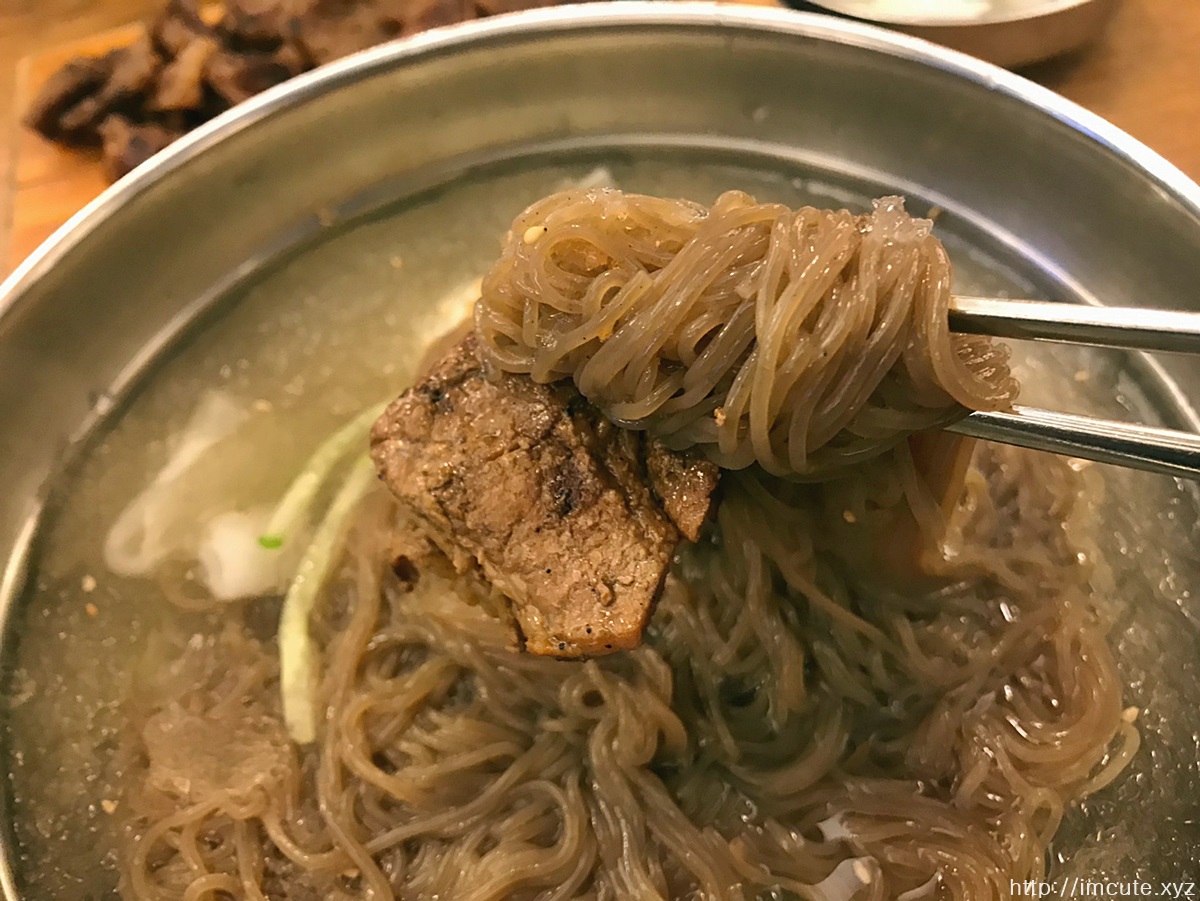고기 2인분입니다. 숯불에 살짝 그을은 고기이며 불맛이 가미되어 있습니다. 비싸지 않은 고기이지만 불향이 나고 또 따로는 잘 안찾아먹을 거 같은데 냉면이랑은 먹고싶은 맛입니다.