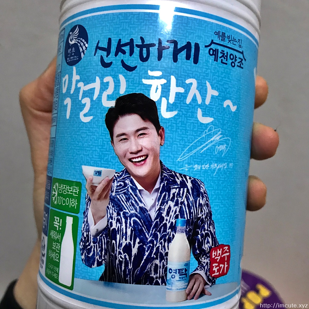 예천양조에 백주도가라고 써있고요 요즘 유명한 트트 가수 영탁님이 웃으며 건배를 하는듯한 모션의 사진이 붙어있었어요.