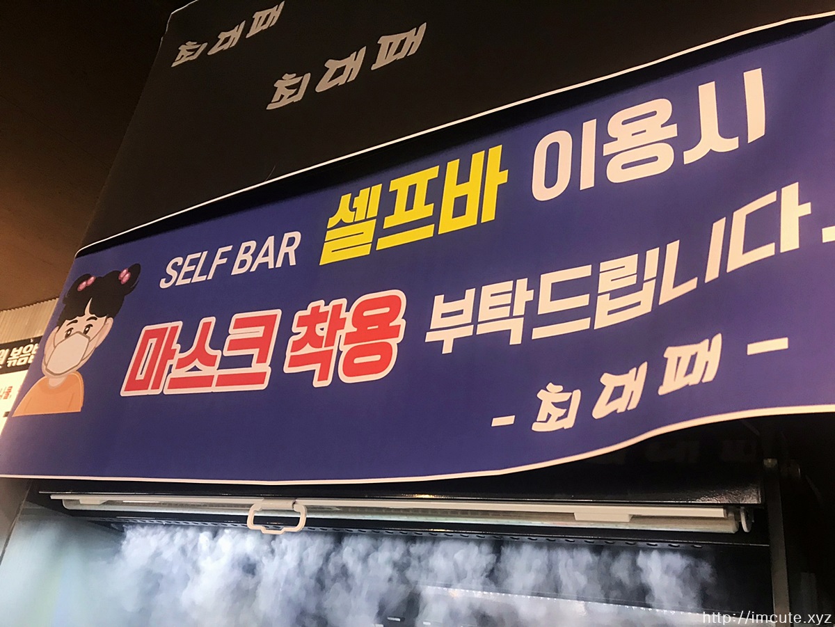 셀프바입니다. 사람들이 저마다 음식을 떠 가는데요 셀프바 이용시에도 마스크를 착용하며 다른 손님께 피해가 되지 않게 이용해주면 될거 같네요.